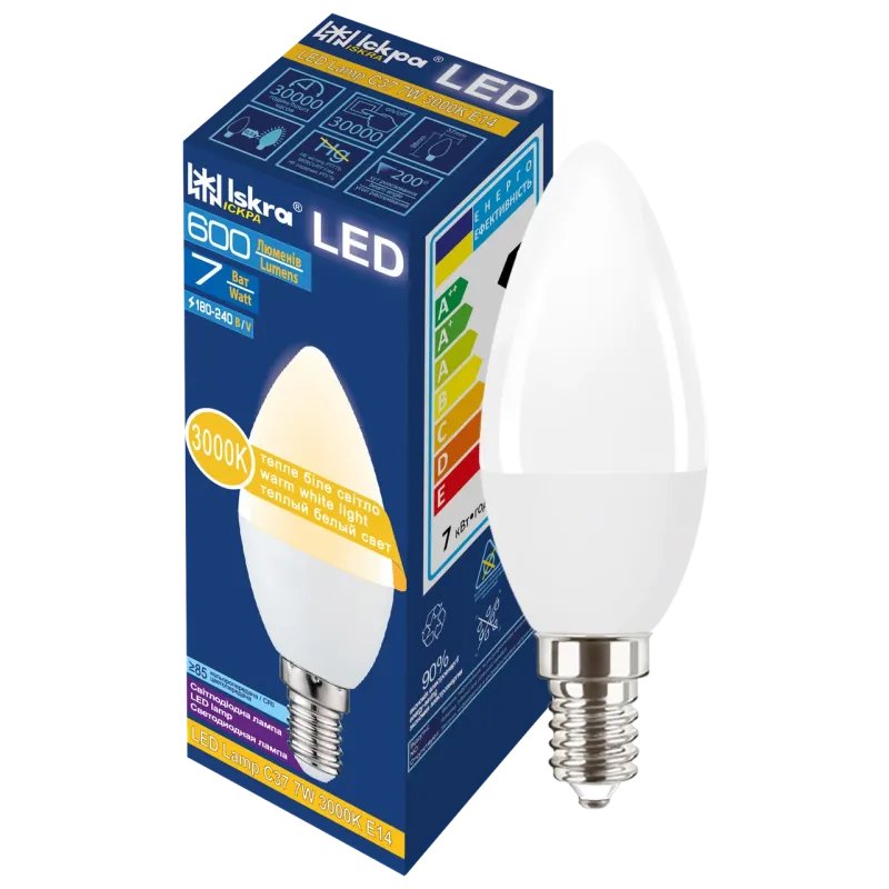 Лампа світлодіодна LED C37 7W 3000K E14 ТМ "Іскра" — сучасне рішення для вашого дому, яке поєднує якісне тепле світло, довговічність та суттєву економію електроенергії. Ідеально підходить для люстр, бра та настільних світильників з цоколем E14.
