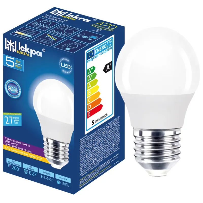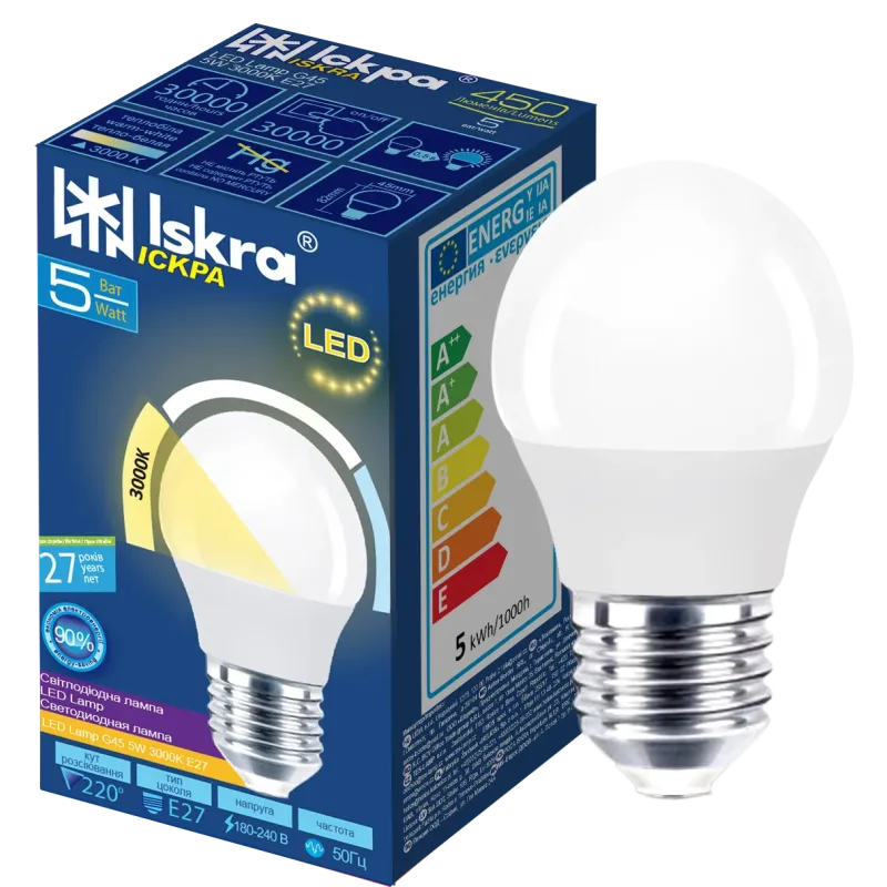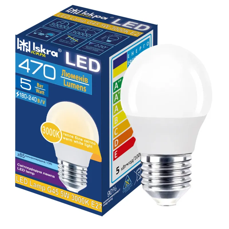 Теги: світлодіодна лампа, LED лампа E27, лампа 5W, тепле світло 3000K, енергозберігаюча лампа, лампа Іскра, LED освітлення