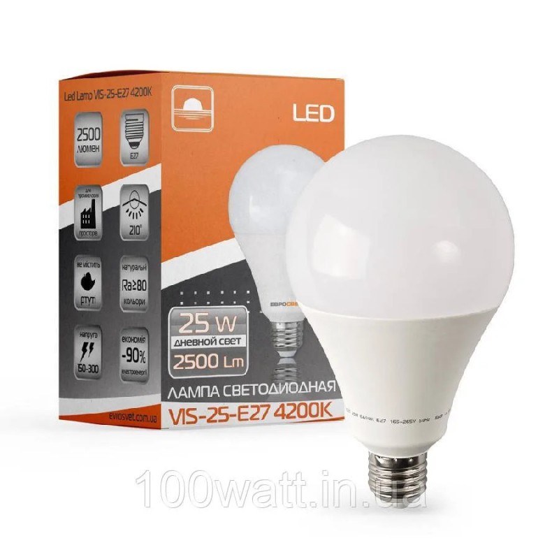 Лампа світлодіодна високопотужна ЕВРОСВЕТ 25Вт 4200К (VIS-25-E27) — професійне рішення для освітлення складів, виробничих цехів, торгових залів та інших просторих приміщень. Нейтральне біле світло забезпечує комфортну роботу без втоми очей протягом усього дня.