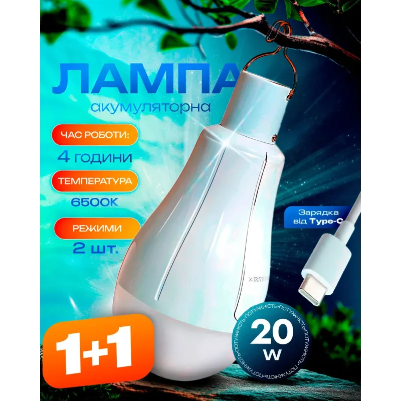 Лампочка на акумуляторі світлодіодна LED лампа аварійна 3 режими роботи автономна 20Вт 2ШТ BRS White