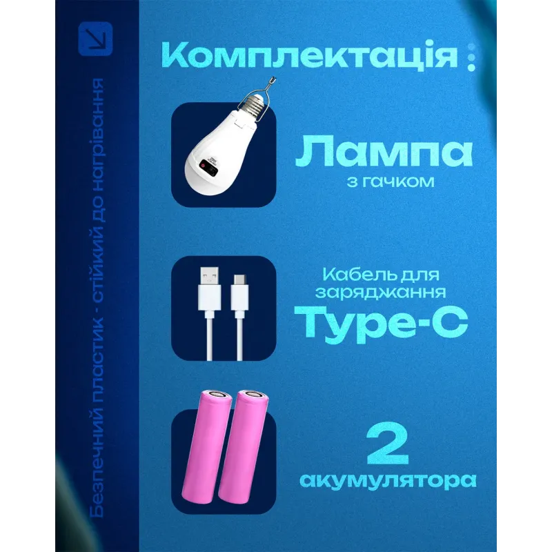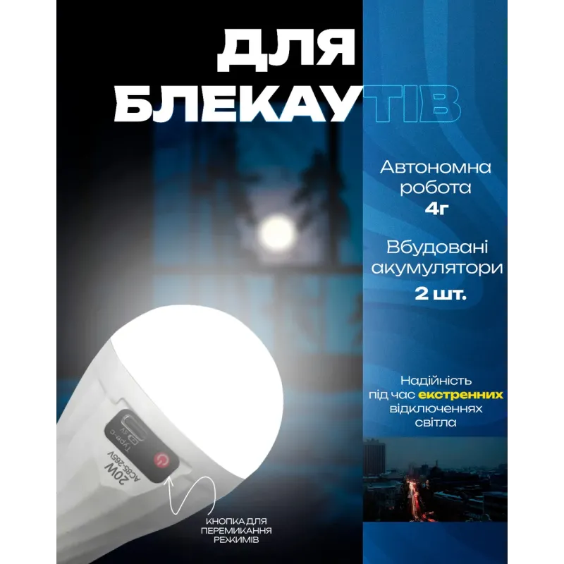 - **Автоматичне перемикання** — лампа сама включається при зникненні світла