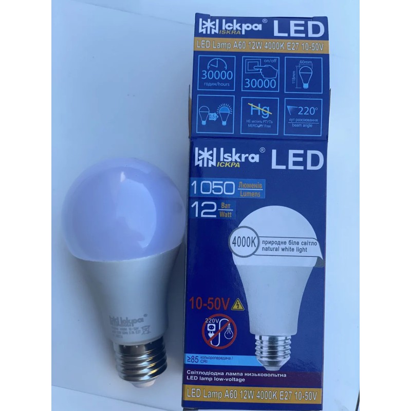 LED Лампа Іскра A60 12W 4000K E27 10-50 V (Груша) | Нейтральний білий світ | Низьковольтна для автономних систем