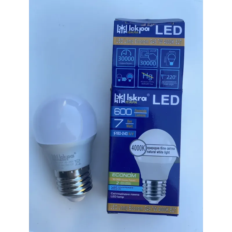 Теги: LED лампа E27, енергозберігаюча лампа, лампа 4000K, LED Іскра, лампа куля G45, світлодіодна лампа 7W, освітлення для дому
