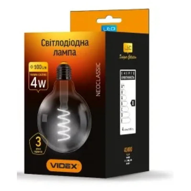 Ця лампа використовує LED-технологію з філаментними нитками, що імітують класичні лампи Едісона. Споживаючи лише 4W, вона забезпечує достатнє освітлення та створює теплу атмосферу завдяки температурі 2100K. Великий розмір G95 робить її ідеальною для відкритих світильників.