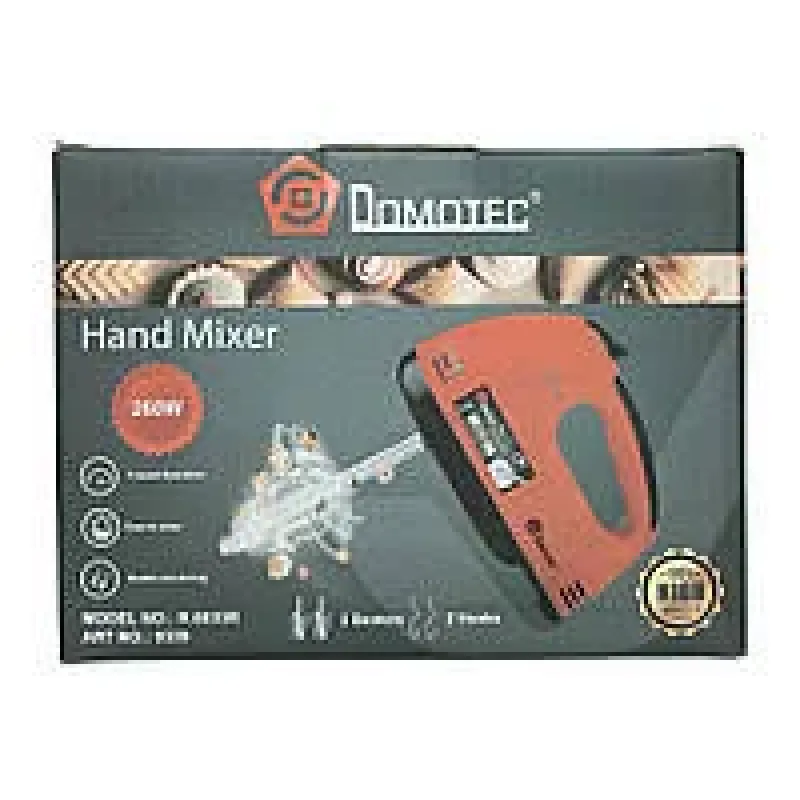 Міксер DOMOTEC R6633R має ергономічний, класичний дизайн, виготовлений з високоякісного та зносостійкого пластику, має надійну та міцну конструкцію, працює досить тихо. Порадує вас своєю практичністю та довговічністю, а також компактними розмірами, його зручно зберігати, знайдеться місце на будь-якій навіть невеликій кухні. Ручний міксер працює на 7 швидкостях, оснащений двигуном потужністю – 260 Вт. Дана модель виконує дві основні функції: заміс та збивання. У стандартну комплектацію входять дві насадки: віночок для збивання та гак для замішування тіста. Кнопка-замок допоможе легко та швидко від’єднати та змінити насадки. Догляд за міксером не складе труднощів, насадки можна мити в посудомийній машині. Ця модель стане вашим вірним помічником на кухні, з ним будь-яка випічка, будь-який десерт буде вам під силу.