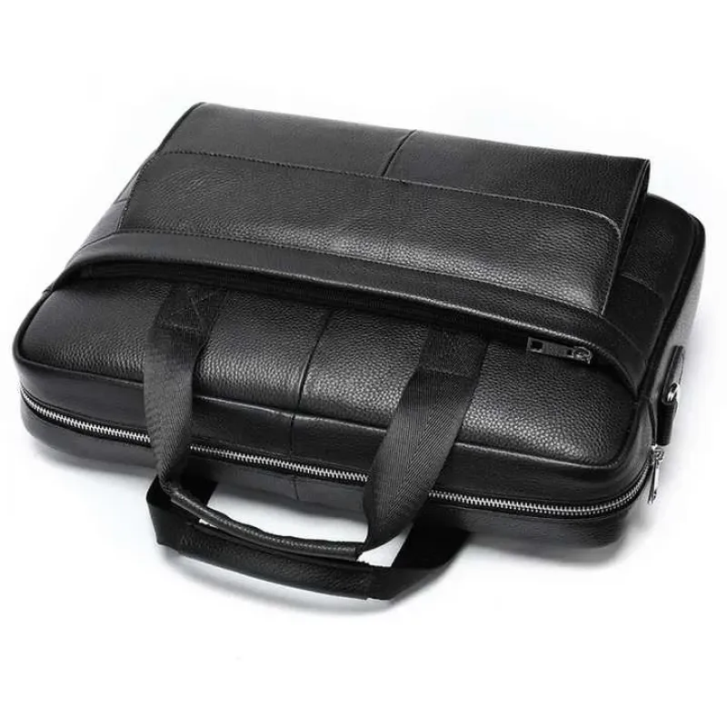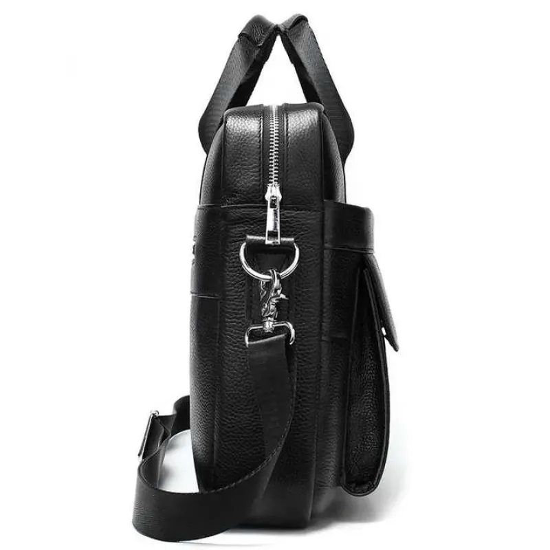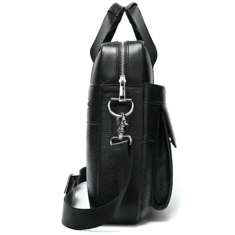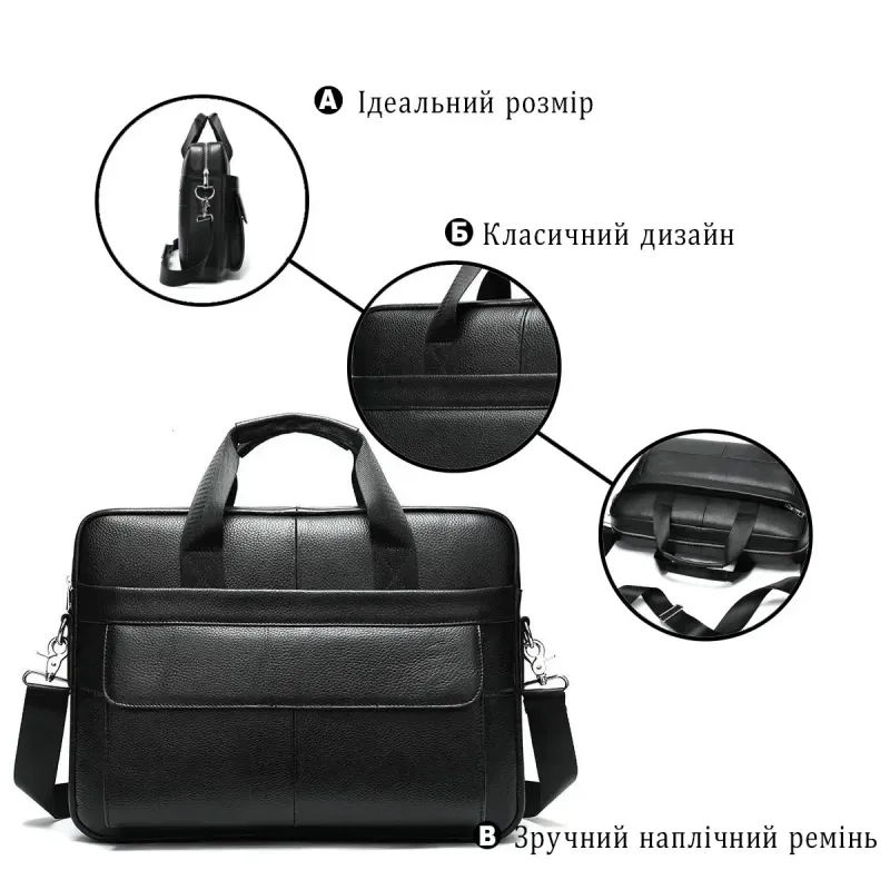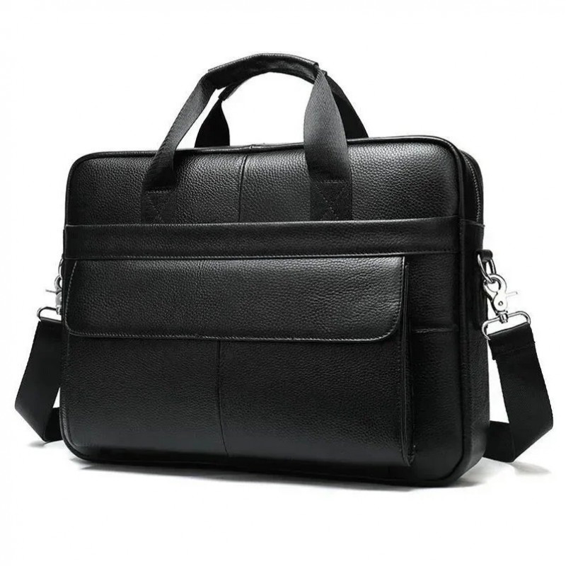 Изящная и вместительная мужская сумка, выполненная из премиальной натуральной кожи (флотар) черного цвета. Изделие сочетает стильный дизайн и высокую функциональность, имеет надежную металлическую фурнитуру и удобную организацию внутреннего пространства. Идеально подходит для работы, деловых встреч или повседневного использования.
