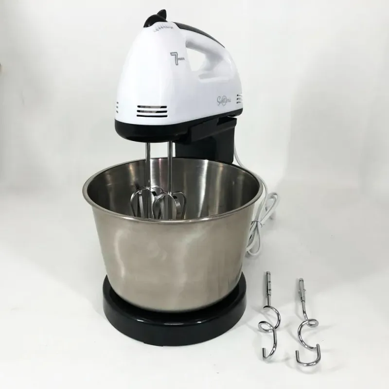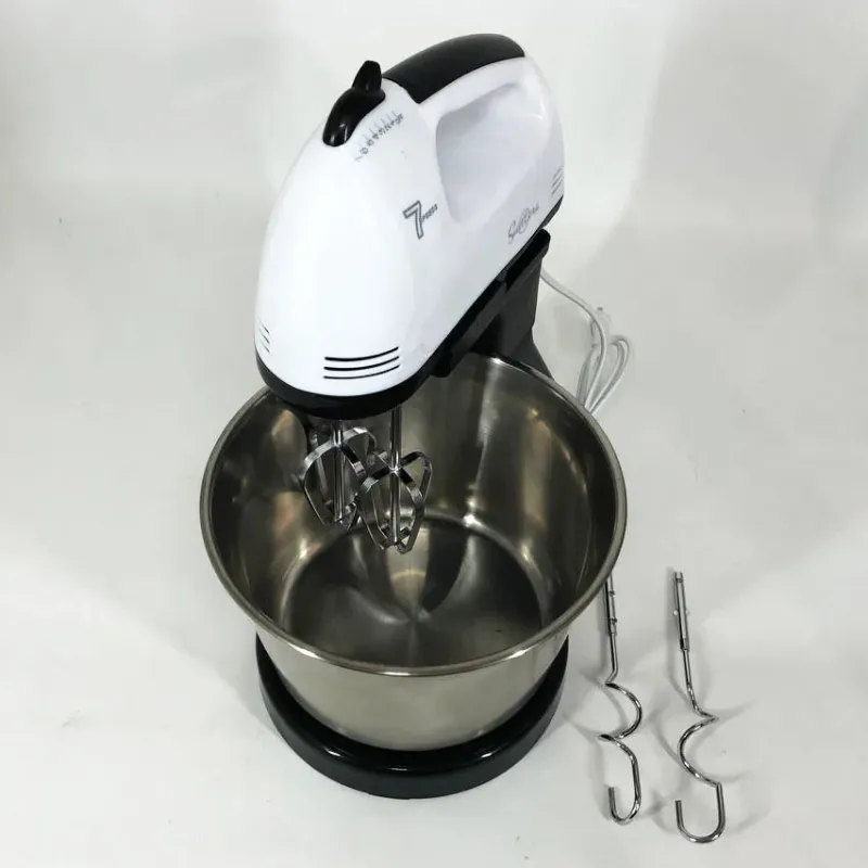 • Насадки у комплекті — вінчики для збивання та гачок для замішування тіста — забезпечують універсальність у використанні для різноманітних кулінарних задач.