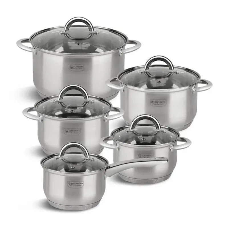 Набір каструль Edenberg 10 предметів із нержавіючої сталі 2.1/2.1/2.9/3.9/6.6л (EB-4005) — для приготування супів, каш, тушкованих страв та варіння на весь сімейний стіл. Якісна нержавіюча сталь або антипригарне покриття забезпечують гігієнічність та довговічність. Скляна кришка дозволяє стежити за процесом приготування без відкривання. Зручні ручки-прихватки не нагріваються. Підходить для всіх видів плит включно з індукційними.