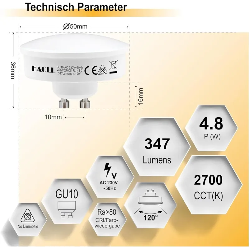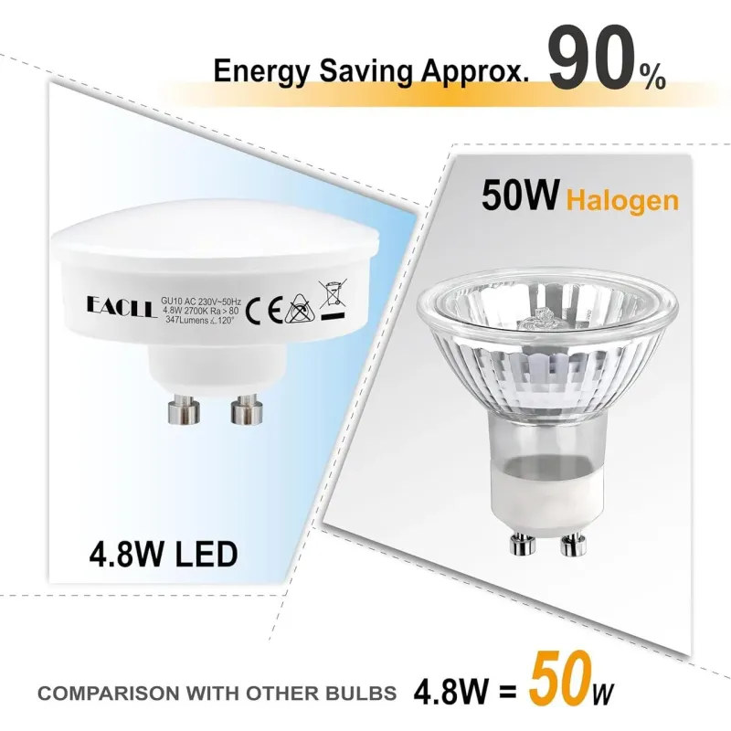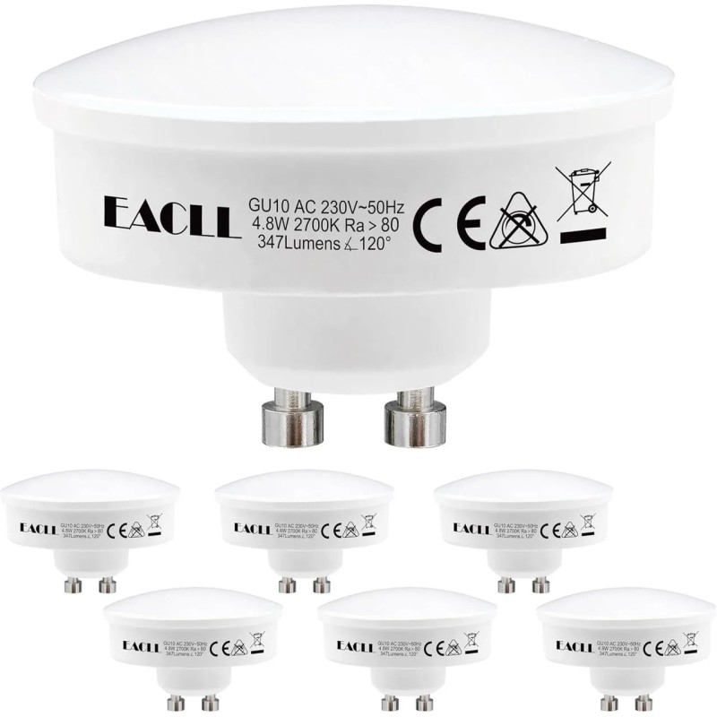 Набір з 6 професійних LED ламп EACLL GU10 потужністю 4.8 Вт створює затишну атмосферу теплого білого світла 2700K при мінімальних витратах електроенергії. Ідеальне рішення для точкових світильників у вітальні, спальні, кухні та офісі.