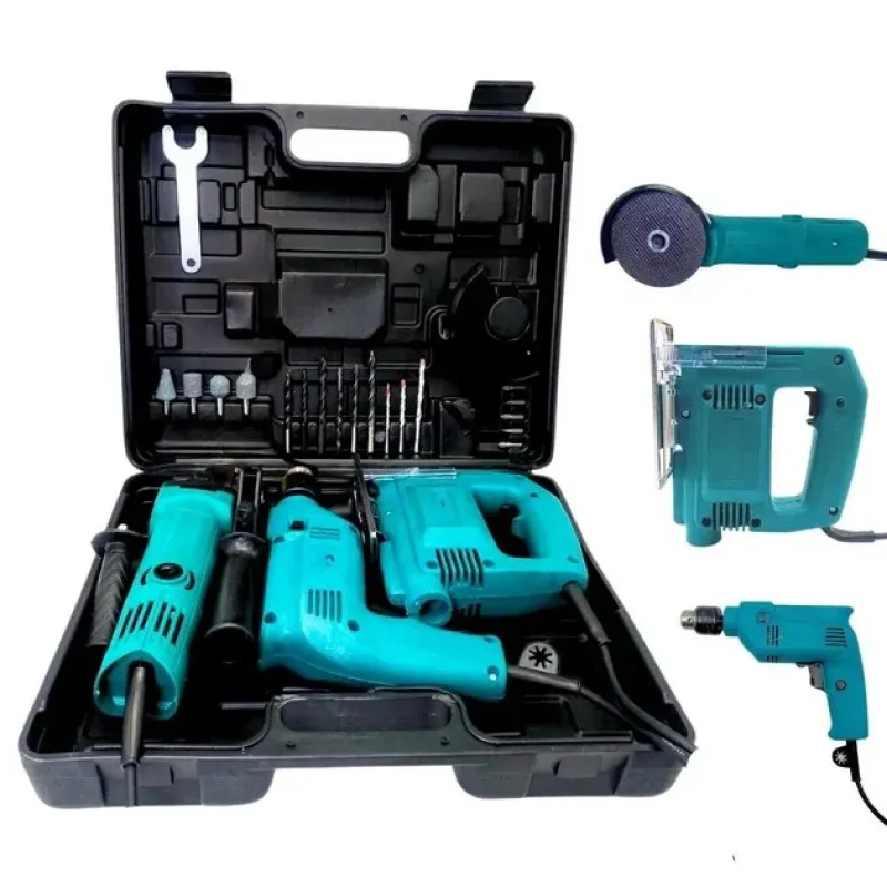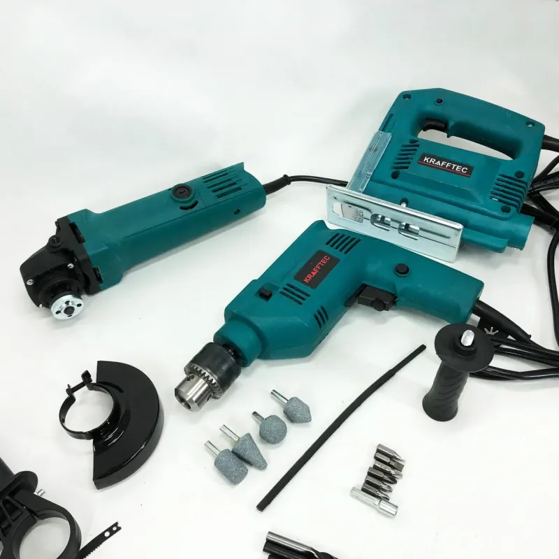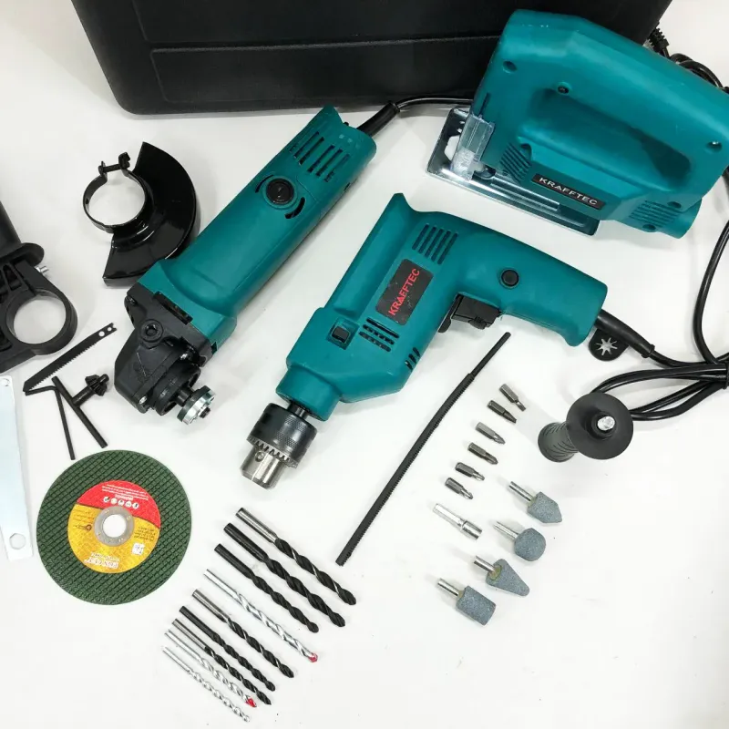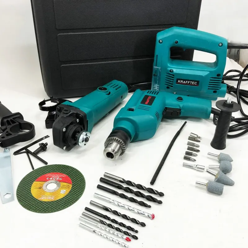В набор входят: дрель ударная, болгарка, лобзик, их комплектующие, набор сверл, биты.