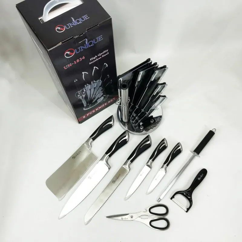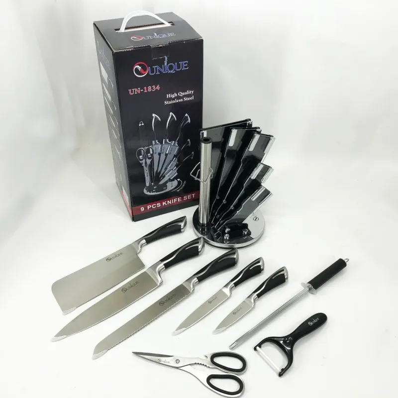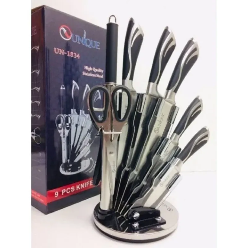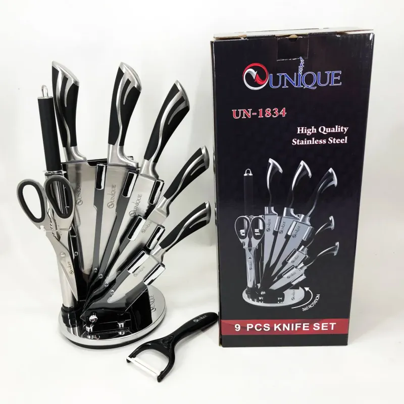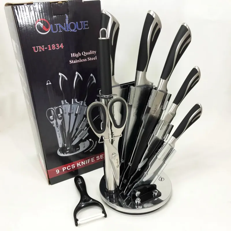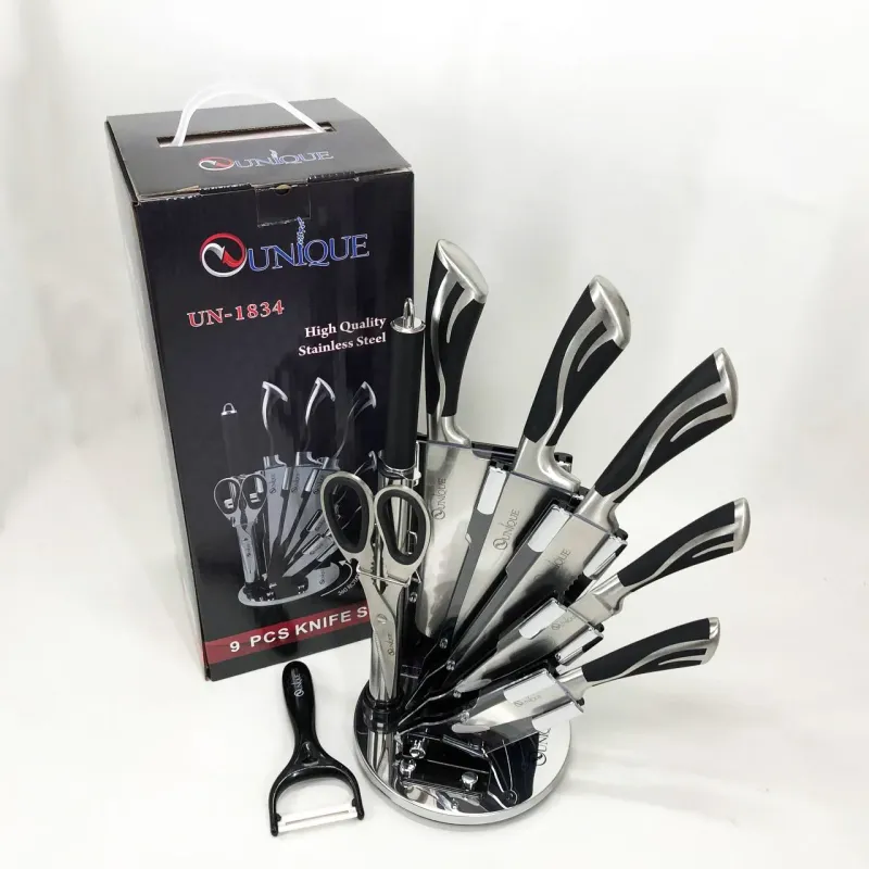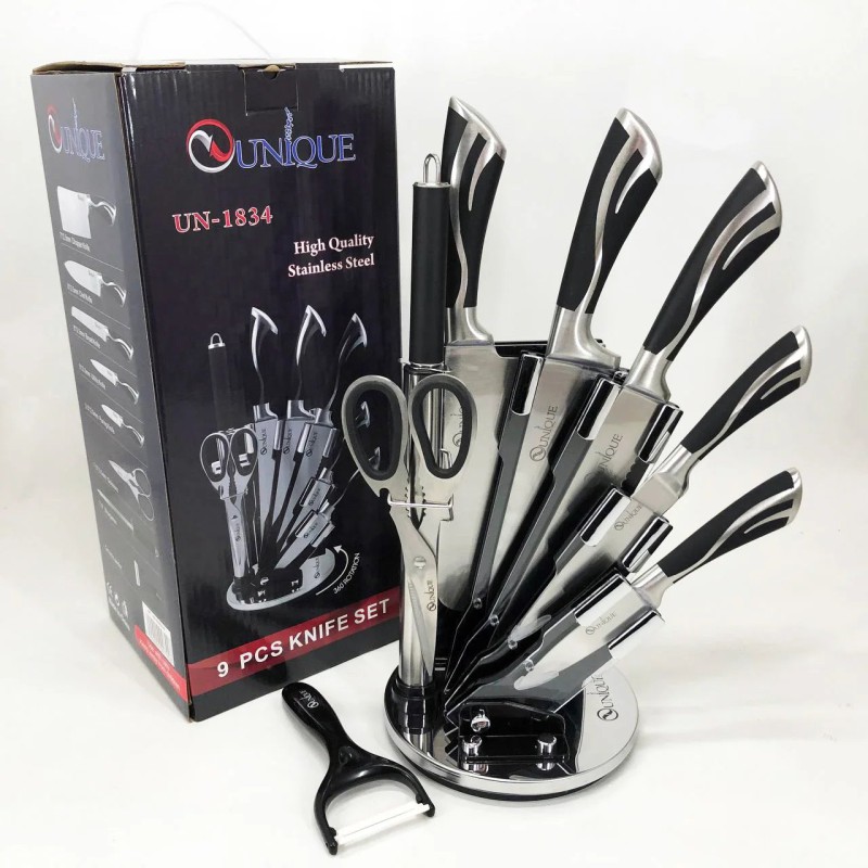 Набор ножей UNIQUE UN-1834 с вращающейся подставкой 9 предметов, Ножи кухонные из нержавеющей стали