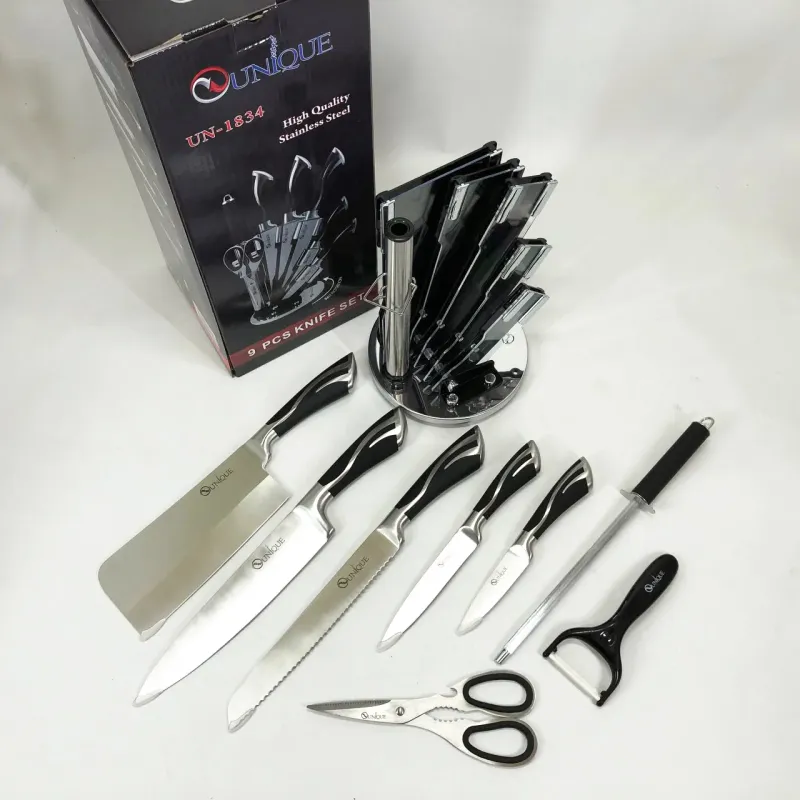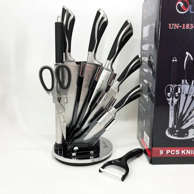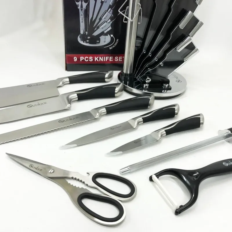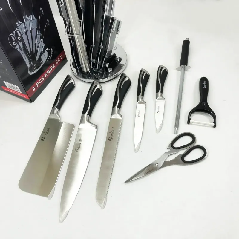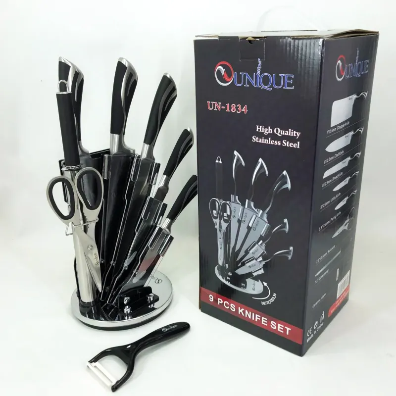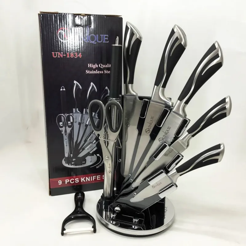 Набор ножей UNIQUE UN-1834 с вращающейся подставкой 9 предметов, Ножи кухонные из нержавеющей стали
