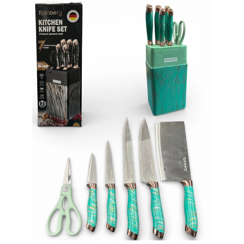 Теги: набір ножів, ножі Rainberg, кухонні ножі, ножі з нержавіючої сталі, RB-2326, набір ножів Green, ножі з підставкою, кухонне приладдя, ножі для кухні, професійні ножі, гострі ножі, якісні ножі, ножі для м'яса, ножі для овочів, кухонний набір, ножі Україна, купити ножі, набір з 7 ножів, зелена підставка