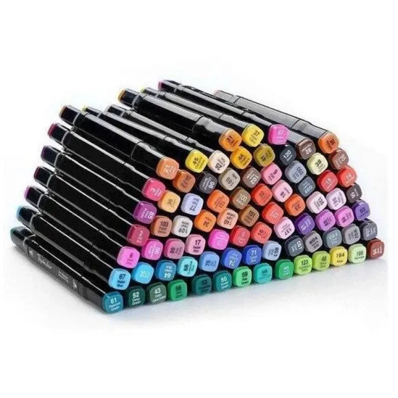 В наборе 80 маркеров разных цветов. Корпус пластиковый, гладкий. Колпачки плотно закрываются. Для удобства распознавания типа пера концы маркеров окрашены разным цветом.