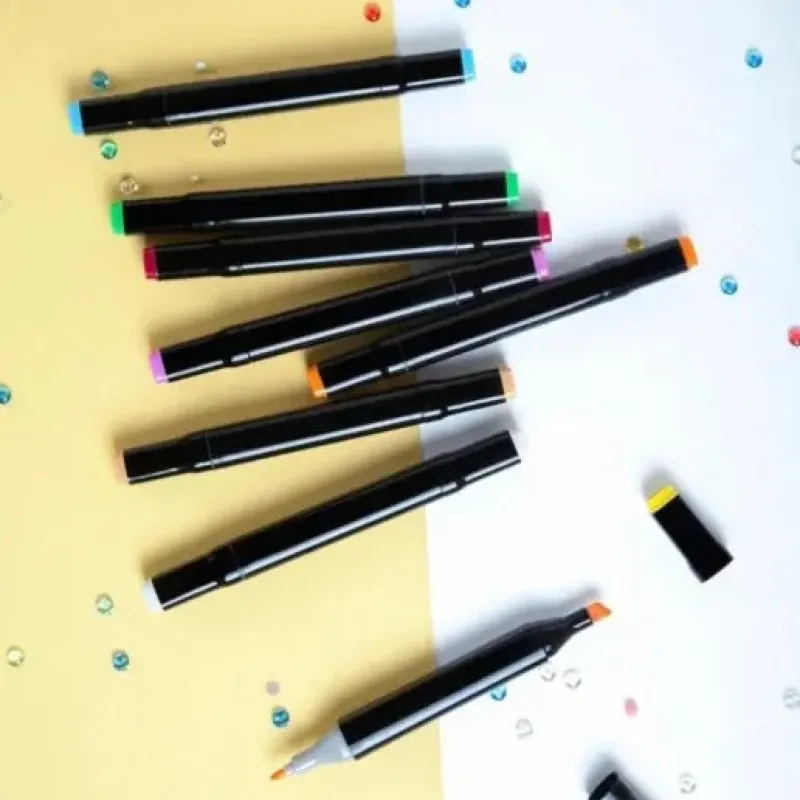 В наборе 60 маркеров разных цветов. Корпус пластиковый, гладкий. Колпачки плотно закрываются. Для удобства распознавания типа пера концы маркеров окрашены разным цветом.