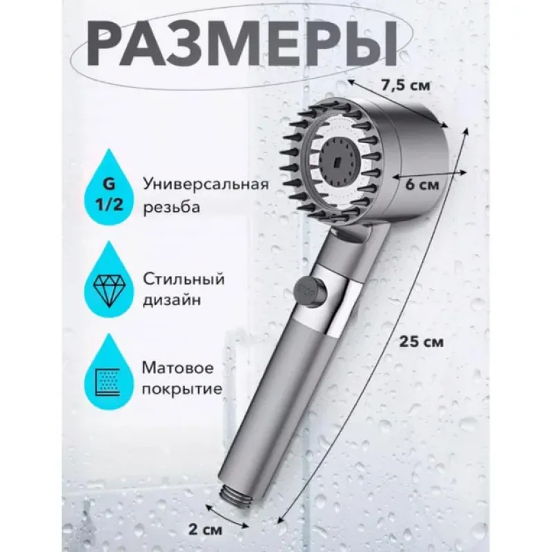 - Эта воронка для душа представляет собой универсальное решение для тех, кто ценит комфорт и функциональность во время душа. Она создает идеальный баланс между расслаблением и эффективностью, обогащая вашу душевую процедуру дополнительными наслаждениями. Мягкие массажные шипы, разнообразные режимы подачи воды, фильтр, вращение и наклон головки – все эти характеристики делают этот ворон отличным выбором для вашей ванной комнаты.