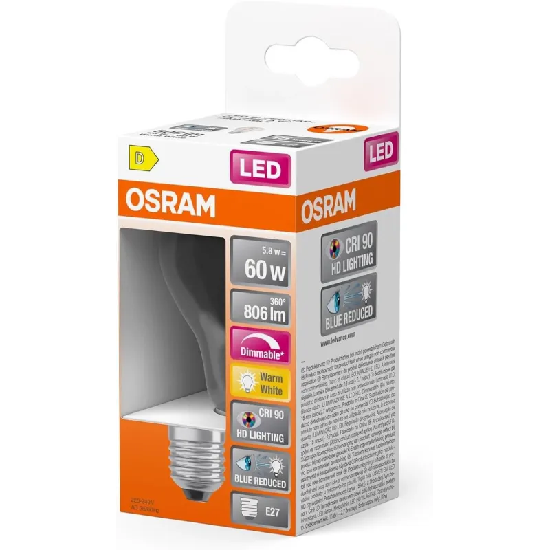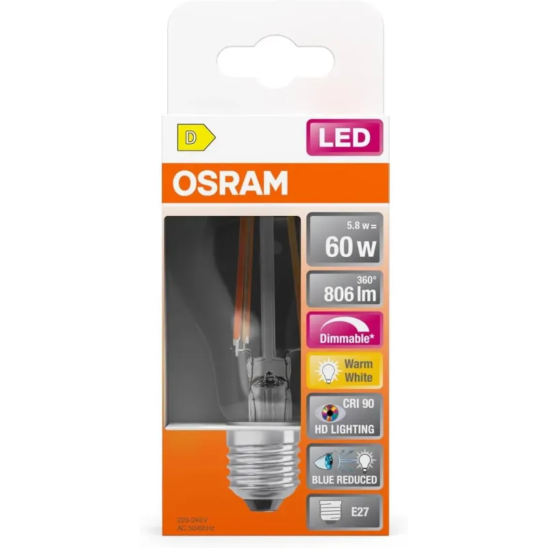 Преміальна LED лампа Osram з технологією філаменту поєднує класичний дизайн лампи розжарювання та сучасну енергоефективність. Заміняє звичайну 60W лампу, споживаючи лише 5.8W, забезпечуючи яскравість 806 лм та природну передачу кольорів завдяки CRI 90.