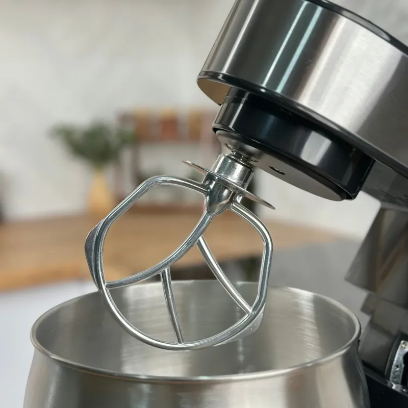 - 3 змінні насадки: металевий гак (для тугого тіста), вінчик (для збивання білків та вершків) та фігурна насадка-бітер (для змішування).
