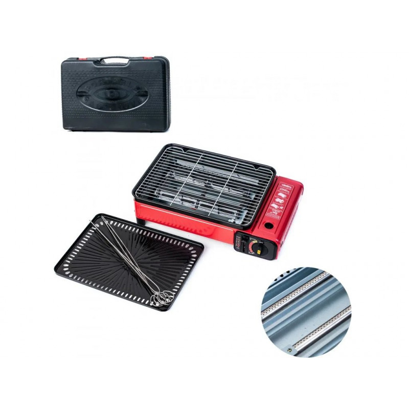 Портативний газовий гриль-барбекю 2в1 (Картридж + Балон). Туристична плита-гриль у кейсі, Червона