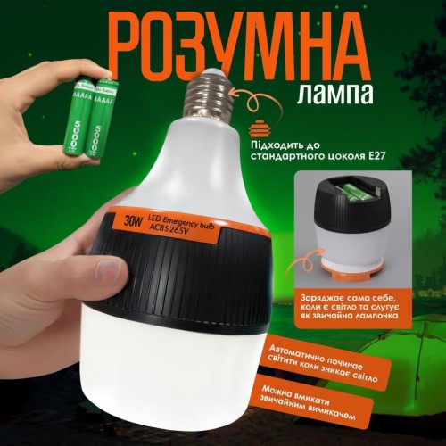 Лампа працює від 3-х батарейок AA, встановлюється у стандартний патрон E27 і миттєво забезпечує потужне світло 30W. Не потрібні дроти, електрики чи складні установки — просто вкрутіть і користуйтесь.