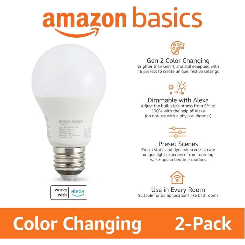 Розумна світлодіодна лампа Amazon Basics E27 8 Вт RGB з керуванням Alexa — це простий спосіб перетворити звичайне освітлення на інтелектуальну систему. 16 мільйонів кольорів, голосове керування та енергоефективність у комплекті з 2 лампами для вашого дому.