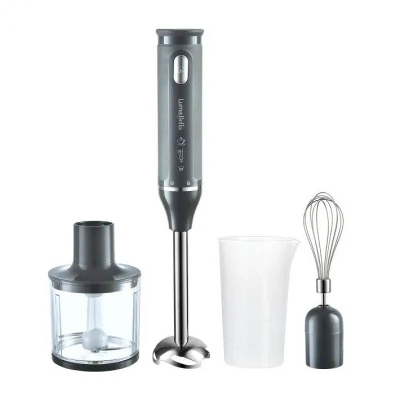 Ручной блендер LumaBella B-2007 — подрібнює, збиває та перемішує за секунди. Потужний мотор легко справляється з льодом, замороженими фруктами та твердими овочами. Загострені леза з нержавіючої сталі рівномірно подрібнюють продукти до потрібної консистенції. Зручна чаша зі шкалою об'єму та щільною кришкою. Просте розбирання та миття в посудомийній машині.