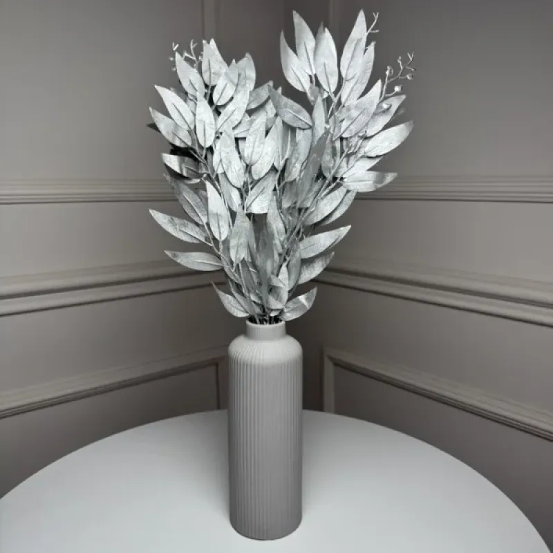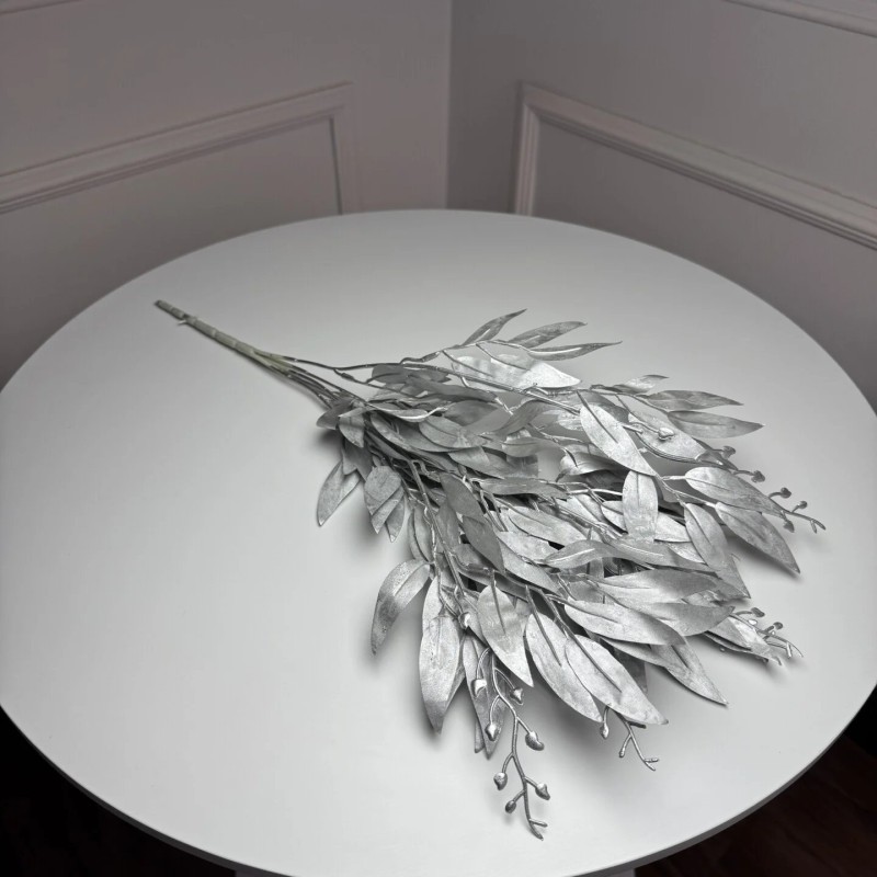 Искусственный букет рускуса в серебряном оттенке выглядит элегантно и современно, придавая интерьеру легкого металлического блеска. Изящные листья с декоративным напылением создают глубину и текстурность, красиво переливаясь при освещении. Композиция выглядит аккуратно и стильно, сохраняя четкую форму и аккуратный силуэт.