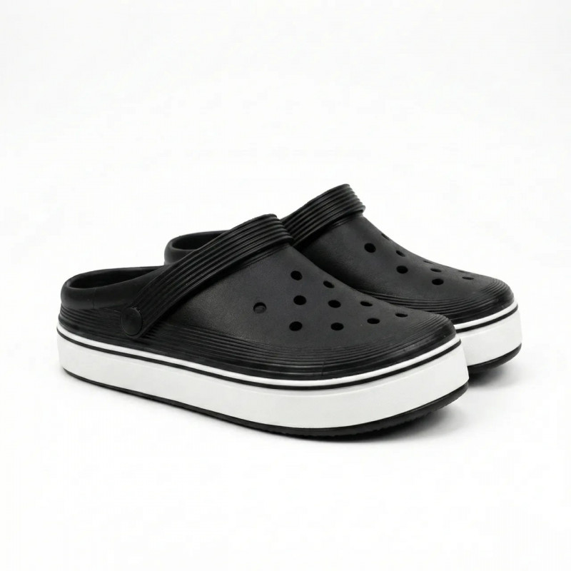 Класичні чоловічі сабо (крокси) від українського виробника Dago Style у універсальному чорному кольорі. Ця модель вирізняється стильною потовщеною підошвою білого кольору, що надає взуттю сучасного спортивного вигляду. Вони стануть чудовим вибором для тих, хто шукає практичне взуття на кожен день: для дому, прогулянок, пляжу, роботи в саду або професійного використання (для медиків, працівників кухні тощо). Взуття виготовлене з гіпоалергенного матеріалу ЕВА (піна). Воно неймовірно легке, еластичне та м'яке. Висока підошва забезпечує відмінну амортизацію при ходьбі, зменшуючи втому ніг. Поворотний п'ятковий ремінець дозволяє фіксувати стопу для більш активного руху або носити сабо як звичайні шльопанці. Матеріал ЕВА стійкий до вологи, не вбирає запахи та дуже легко миється. Перфорація у верхній частині забезпечує вільну циркуляцію повітря, тому ногам буде комфортно навіть у спекотну погоду. Чорний колір робить модель максимально практичною та невибагливою у догляді. Характеристики: Матеріал: Піна ЕВА (EVA) Колір: Чорний з білою підошвою Виробник: Dago Style Сезон: Літо / Цілорічно (у приміщенні) Стать: Чоловічі Розміри в наявності: 41, 42, 43, 44, 45 Країна виробник: Україна