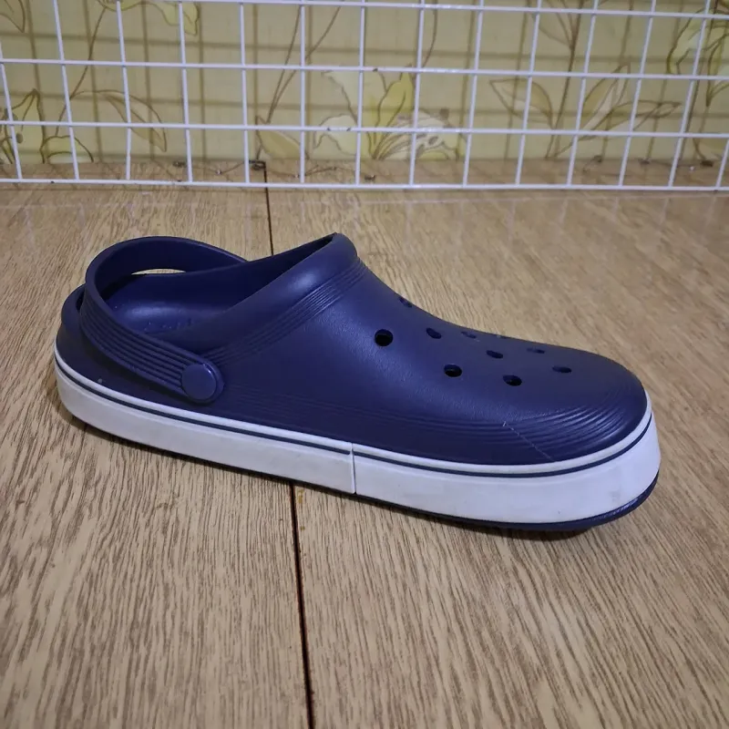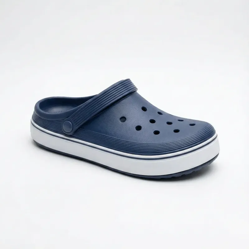 Універсальні та стильні чоловічі сабо (крокси) у темно-синьому кольорі. Ця модель виділяється ефектною білою підошвою, що надає взуттю сучасного спортивного вигляду. Ідеальний вибір для щоденного використання влітку, відпочинку на пляжі, роботи на дачі або для професійного використання (наприклад, медиками чи кухарями). Взуття виготовлене з високоякісної піни ЕВА (EVA), завдяки чому воно неймовірно легке та м'яке. Матеріал не вбирає вологу, легко миється та швидко сохне. Перфорація у верхній частині забезпечує відмінну вентиляцію, дозволяючи ногам "дихати" навіть у найспекотніші дні. П'ятковий ремінець надійно фіксує ногу, перетворюючи шльопанці на зручні сандалі для активної ходьби. Переваги моделі: Комфорт: Анатомічна форма та амортизуюча підошва знижують навантаження на стопи. Практичність: Стійкі до зносу, не бояться води та бруду. Дизайн: Класичний синій колір у поєднанні з контрастною білою платформою пасує до будь-якого літнього одягу. Характеристики: Матеріал: Піна ЕВА (EVA) Колір: Темно-синій з білою підошвою Сезон: Літо / Демісезон (для приміщень) Стать: Чоловічі Розміри в наявності: 41-45 Країна виробник: Україна