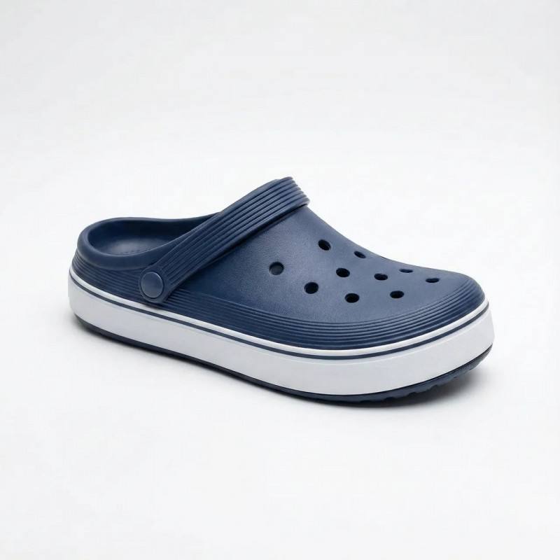 Універсальні та стильні чоловічі сабо (крокси) у темно-синьому кольорі. Ця модель виділяється ефектною білою підошвою, що надає взуттю сучасного спортивного вигляду. Ідеальний вибір для щоденного використання влітку, відпочинку на пляжі, роботи на дачі або для професійного використання (наприклад, медиками чи кухарями). Взуття виготовлене з високоякісної піни ЕВА (EVA), завдяки чому воно неймовірно легке та м'яке. Матеріал не вбирає вологу, легко миється та швидко сохне. Перфорація у верхній частині забезпечує відмінну вентиляцію, дозволяючи ногам "дихати" навіть у найспекотніші дні. П'ятковий ремінець надійно фіксує ногу, перетворюючи шльопанці на зручні сандалі для активної ходьби. Переваги моделі: Комфорт: Анатомічна форма та амортизуюча підошва знижують навантаження на стопи. Практичність: Стійкі до зносу, не бояться води та бруду. Дизайн: Класичний синій колір у поєднанні з контрастною білою платформою пасує до будь-якого літнього одягу. Характеристики: Матеріал: Піна ЕВА (EVA) Колір: Темно-синій з білою підошвою Сезон: Літо / Демісезон (для приміщень) Стать: Чоловічі Розміри в наявності: 41-45 Країна виробник: Україна