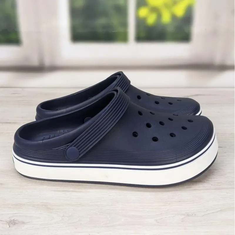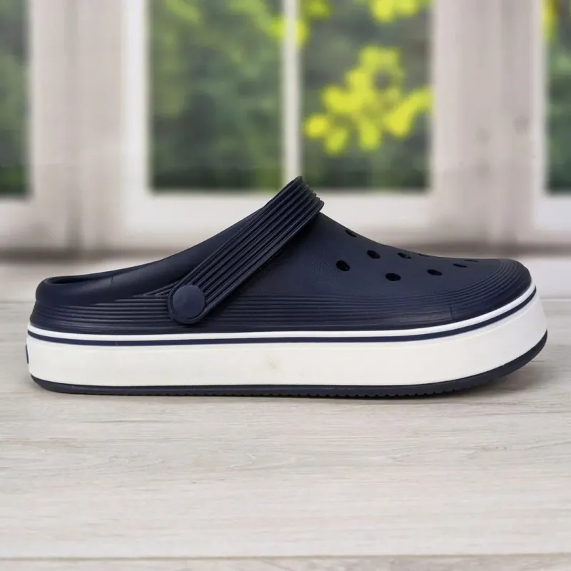 Чоловічі сабо (крокси) від популярного українського бренду Dago Style — це поєднання сучасного дизайну та максимального комфорту. Модель виконана в насиченому синьому кольорі з контрастною білою смугою на підошві, що надає взуттю стильного спортивного вигляду. Ці сабо ідеально підходять як для пляжного відпочинку та відвідування басейну, так і для повсякденного носіння вдома, на дачі або навіть як зручне робоче взуття (для медиків, кухарів тощо). Виготовлені з якісного матеріалу ЕВА (піна), ці крокси надзвичайно легкі, м'які та еластичні. Потовщена підошва-платформа не лише додає стилю, але й забезпечує чудову амортизацію, захищаючи стопу від нерівностей поверхні. Поворотний ремінець дозволяє надійно зафіксувати п'яту для активного руху або носити взуття як звичайні шльопанці. Матеріал ЕВА не вбирає вологу та запахи, гіпоалергенний і дуже простий у догляді — достатньо промити водою. Отвори у верхній частині забезпечують відмінну вентиляцію, тому вашим ногам буде комфортно навіть у спеку. Характеристики: Матеріал: Піна ЕВА (EVA) Колір: Синій (Navy) з білою смугою Виробник: Dago Style Сезон: Літо / Цілорічно (у приміщенні) Стать: Чоловічі Розміри в наявності: 41, 42, 43, 44, 45 Країна виробник: Україна