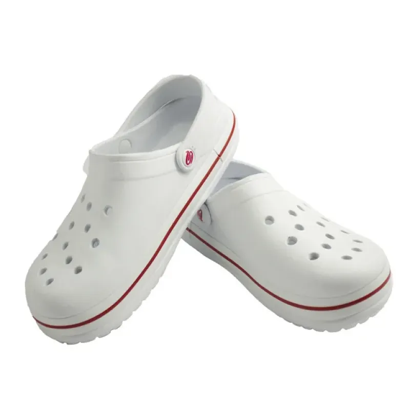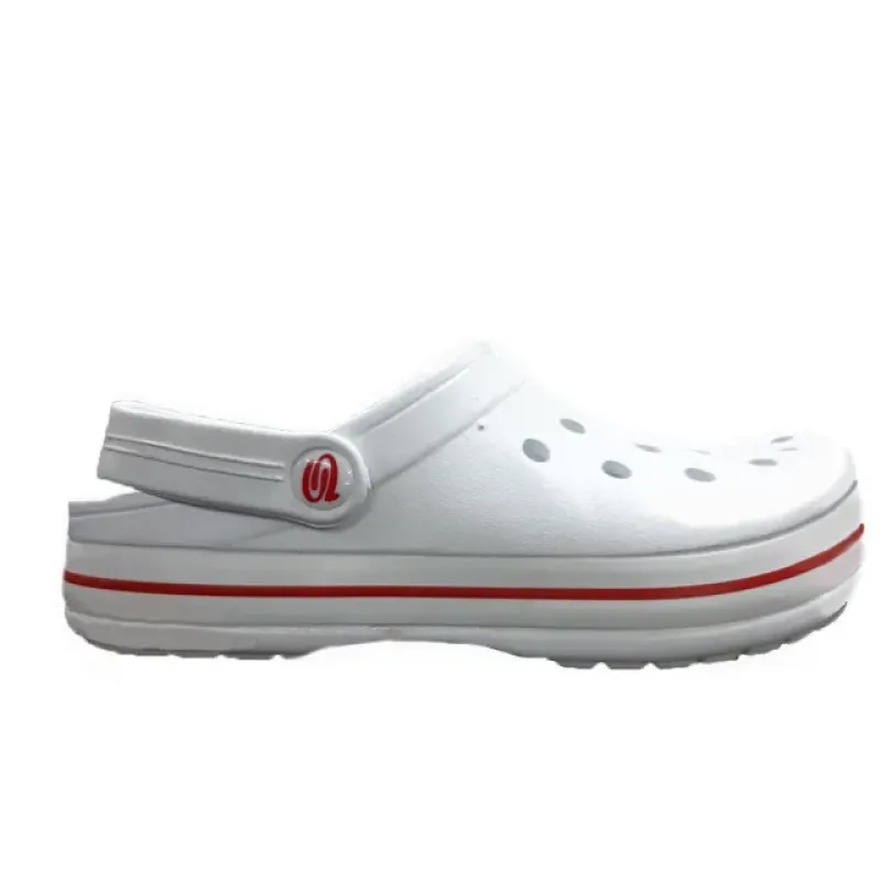 Ці білі чоловічі сабо з червоною окантовкою — ідеальний вибір для тих, хто шукає комфортне професійне або літнє взуття. Білий колір традиційно обирають медичні працівники, фармацевти, кухарі та працівники лабораторій, адже він асоціюється з чистотою. Модель виготовлена з гіпоалергенного матеріалу EVA (пінка), який легко миється, піддається дезінфекції та не вбирає запахи. Тонка червона смужка вздовж підошви та червоний логотип на кнопці додають моделі стильного акценту, розбавляючи стерильний білий колір. Завдяки перфорації зверху, ноги вільно дихають протягом усього дня. Поворотний ремінець дозволяє надійно зафіксувати сабо на п'яті для безпечної роботи або активного відпочинку. Характеристики: Тип: Сабо / Крокси. Призначення: Медицина, HoReCa (кухня), пляж. Матеріал: EVA (пінка). Колір: Білий з червоним (White/Red). Розмірний ряд: 40, 41, 42, 43, 44, 45, 46. Особливості: Червона смужка, вентиляція.