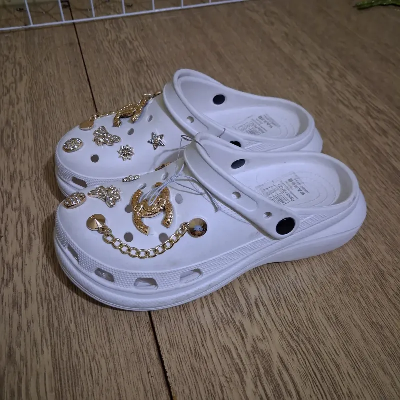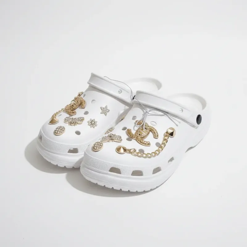 Шукаєте ідеальне поєднання комфорту та яскравого стилю? Ці жіночі білі сабо на платформі — справжній хіт сезону! Модель виготовлена з сучасного матеріалу ЕВА, що робить її невагомою та неймовірно зручною. Висока підошва візуально подовжує ноги, не обтяжуючи ходу, а ергономічна устілка забезпечує комфорт навіть при тривалому носінні. Головна "фішка" цієї пари — розкішний декор. Золотисті ланцюжки, фігурні джибітси у вигляді логотипів, метеликів та зірок, інкрустовані камінням, перетворюють звичайні шльопанці на модний акцент вашого образу. Поворотний ремінець дозволяє надійно зафіксувати п'яту, перетворюючи шльопанці на зручні сандалі. Це взуття ідеально підходить як для прогулянок містом чи відпочинку на пляжі, так і як професійне взуття для лікарів, косметологів або перукарів, які цінують стиль на робочому місці. Матеріал стійкий до вологи, не вбирає запахи та дуже легко миється. Характеристики: Матеріал: Піна ЕВА (EVA) — м'який, гіпоалергенний, зносостійкий Колір: Білий Декор: Знімні джибітси (золотистий метал, стрази, ланцюжки) Тип підошви: Платформа (потовщена підошва) Сезон: Літо / Весна / Осінь (для приміщень) Стать: Жіноча Розмірний ряд: 36-41 Країна виробник: Китай