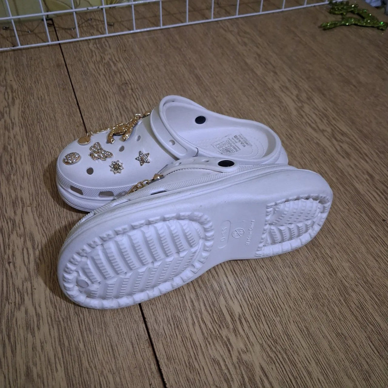 Шукаєте ідеальне поєднання комфорту та яскравого стилю? Ці жіночі білі сабо на платформі — справжній хіт сезону! Модель виготовлена з сучасного матеріалу ЕВА, що робить її невагомою та неймовірно зручною. Висока підошва візуально подовжує ноги, не обтяжуючи ходу, а ергономічна устілка забезпечує комфорт навіть при тривалому носінні. Головна "фішка" цієї пари — розкішний декор. Золотисті ланцюжки, фігурні джибітси у вигляді логотипів, метеликів та зірок, інкрустовані камінням, перетворюють звичайні шльопанці на модний акцент вашого образу. Поворотний ремінець дозволяє надійно зафіксувати п'яту, перетворюючи шльопанці на зручні сандалі. Це взуття ідеально підходить як для прогулянок містом чи відпочинку на пляжі, так і як професійне взуття для лікарів, косметологів або перукарів, які цінують стиль на робочому місці. Матеріал стійкий до вологи, не вбирає запахи та дуже легко миється. Характеристики: Матеріал: Піна ЕВА (EVA) — м'який, гіпоалергенний, зносостійкий Колір: Білий Декор: Знімні джибітси (золотистий метал, стрази, ланцюжки) Тип підошви: Платформа (потовщена підошва) Сезон: Літо / Весна / Осінь (для приміщень) Стать: Жіноча Розмірний ряд: 36-41 Країна виробник: Китай