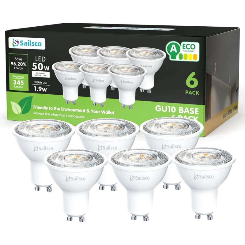 Sailsco - Світлодіодні лампи-прожектори GU10, 1.9 Вт еквівалент 50Вт, 345Лм, 2700K, теплий білий колір. Комплект - 6 штук