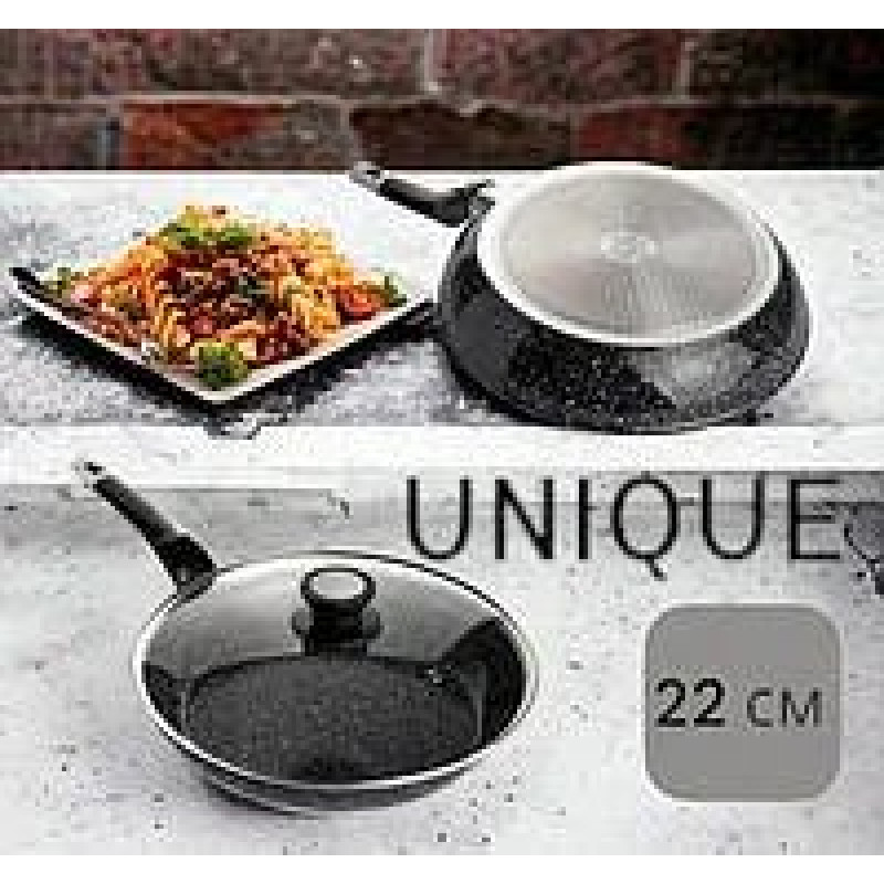 Торгова марка Unique – відома своїми традиціями створення якісного та не дорогого посуду. Сковорода зі скляною кришкою UNIQUE виготовлена з литого алюмінію з багатошаровим гранітним антипригарним покриттям. Перевага цього покриття – це багатошарове покриття з кількох шарів кам’яної крихти на мінеральній основі. Таке покриття визнано одним із найбезпечніших для здоров’я людей та навколишнього середовища. Сковорода зі скляною кришкою, антипригарними властивостями, вона зносостійка та довговічна. Нова система пористого антипригарного покриття дозволяє просмажувати продукти до хрусткої скоринки. Стильна і зручна довговічна сковорода з гранітним покриттям знайде своє місце на будь-якій кухні. Перед першим використанням вимийте посуд миючим засобом, промийте, просушіть. Забороняється використовувати металеві губки, а також засоби, що містять абразивні добавки та хлор. Для миття посуду можна використовувати посудомийну машину та ручне миття. Різкий перепад температур може призвести до псування покриття, тому не ставте на гарячу конфорку посуд із холодильника. Готувати їжу слід за невеликого або середнього нагрівання. Не залишайте на гарячій конфорці посуд на тривалий час. Посуд з антипригарним покриттям прослужить довше, якщо продукти помішувати в ній дерев’яними, пластиковими або силіконовими інструментами UNIQUE. Якщо ви зберігаєте посуд у стосі, використовуйте між предметами спеціальні вкладки для зберігання посуду, щоб захистити поверхню від подряпин. Діаметр посуду повинен збігатися з розміром конфорки, при використанні на газовій плиті полум’я не повинне стосуватися стінок посуду. У цьому випадку ручки менше нагріватимуться. У будь-якому випадку, щоб уникнути опіків, слід уникати різкої зміни температури при використанні виробу. Не можна мити посуд поки вона гаряча. Остудіть її до кімнатної температури. Будь ласка, дотримуйтесь рекомендацій щодо догляду, і посуд прослужить вам дуже довго.