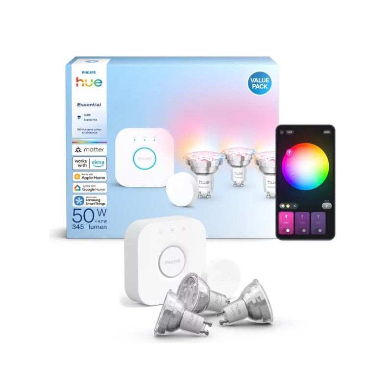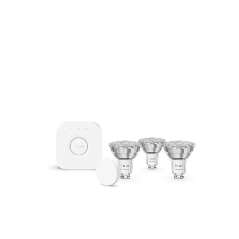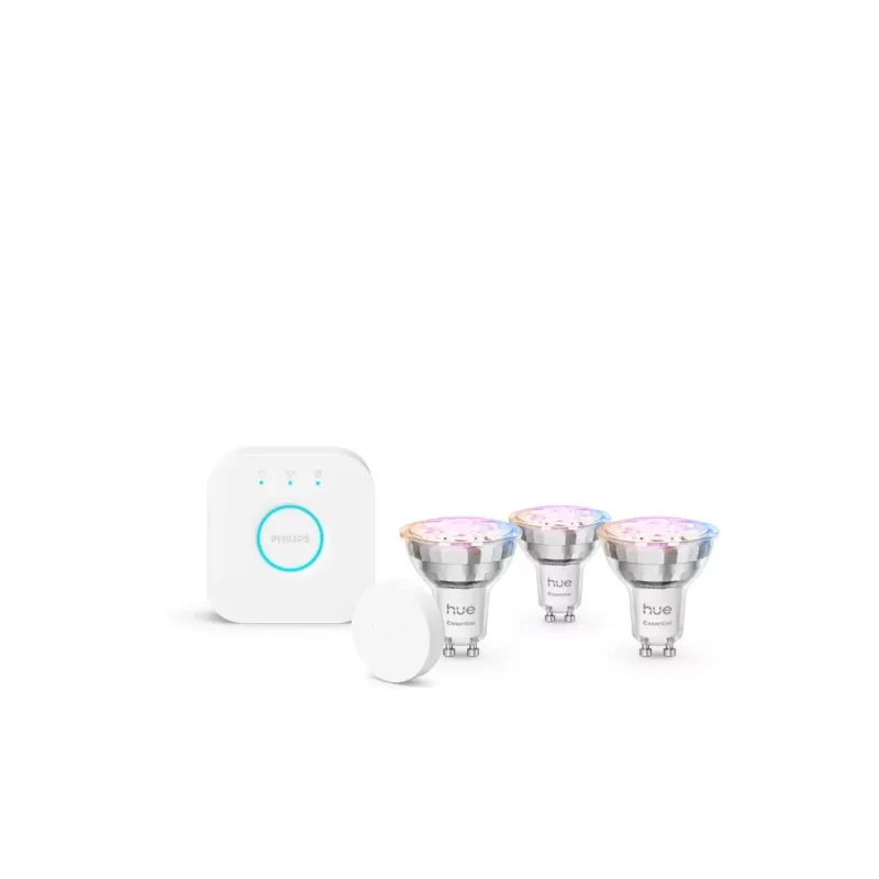 Стартовий набір Philips Hue Essential GU10 — це готове рішення для тих, хто хоче отримати повний контроль над освітленням без складного монтажу. 3 RGB-лампи, Bridge для керування та Smart Button у комплекті — все необхідне для створення ідеальної атмосфери в будь-якій кімнаті.