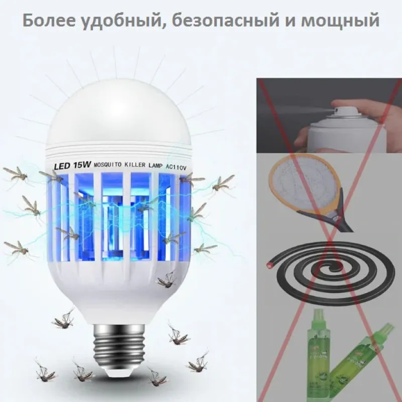 - основной, при котором работает мощная светодиодная лампа 9W + мягкий синий свет, приманивающий насекомых и защищенная металлическая обмотка, которая убивает их;