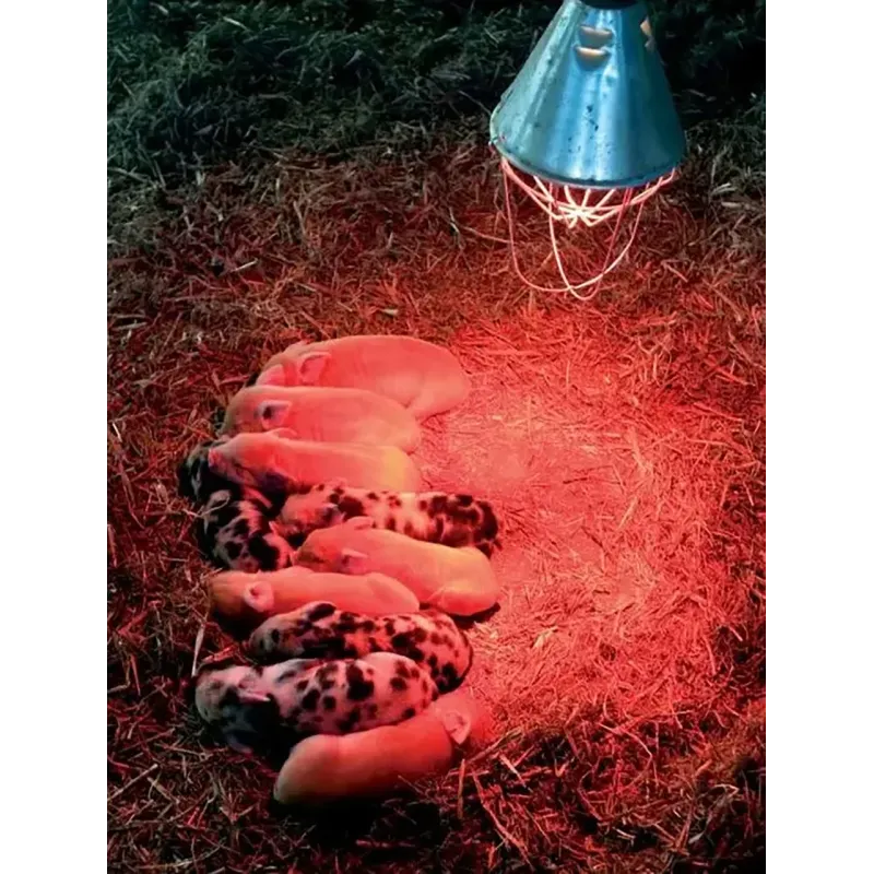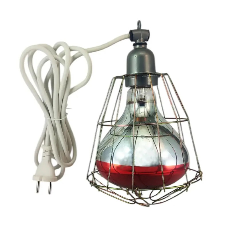 Встановіть світильник на висоті 40-60 см над тваринами, вкрутіть лампу 250 Вт, підключіть до мережі 220 В. Регулюйте висоту для досягнення комфортної температури 28-32°C для молодняку.