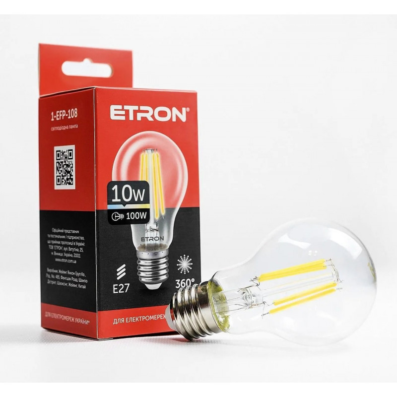 Теги: світлодіодна лампа, філаментна лампа, ETRON 10W, лампа E27, енергозберігаюча лампа, LED лампа A60, нейтральне світло 4200K
