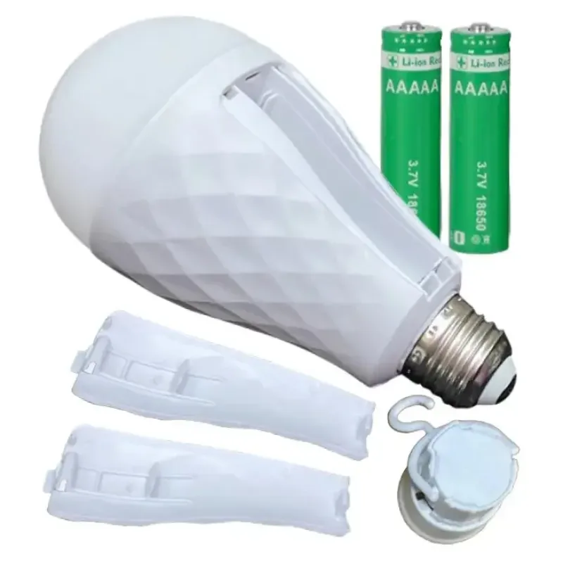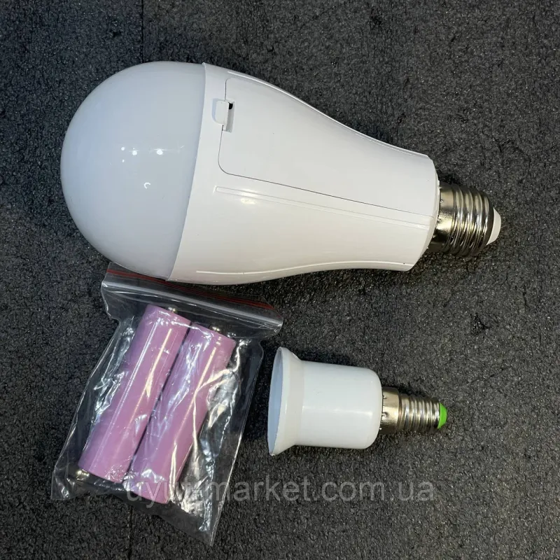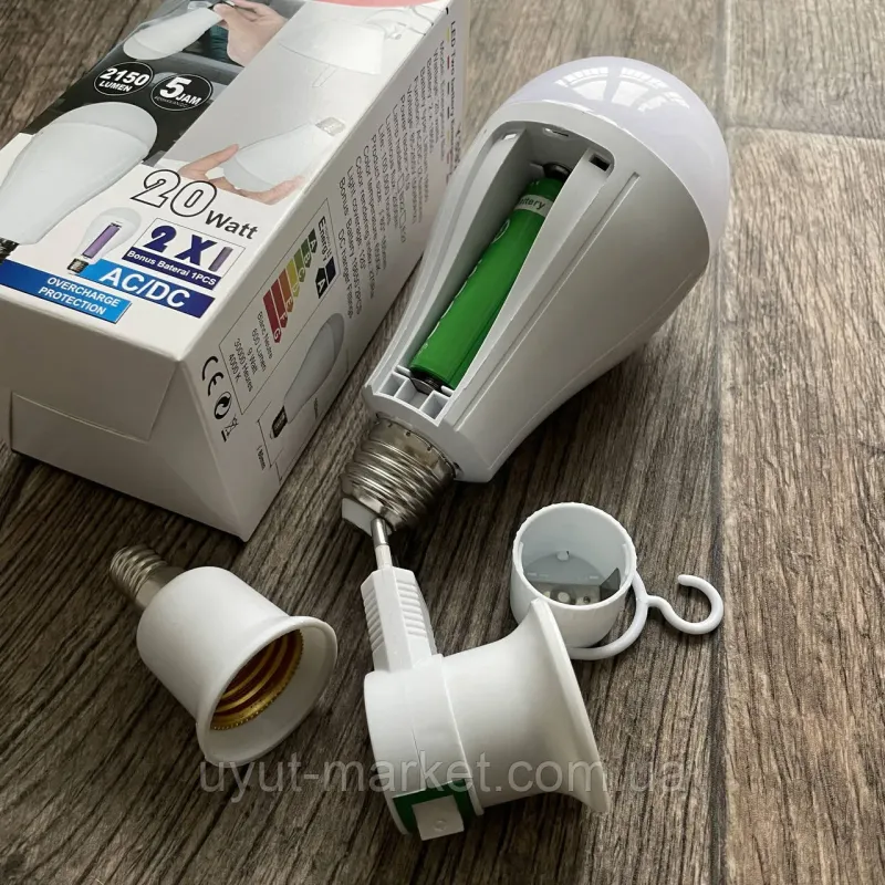 Лампа працює як звичайна при наявності електрики, але миттєво перемикається на акумулятор при відключенні. Універсальний цоколь E27/E14 з перехідником підходить для будь-яких світильників. Яскраве холодне світло 6500К забезпечує комфортне освітлення.