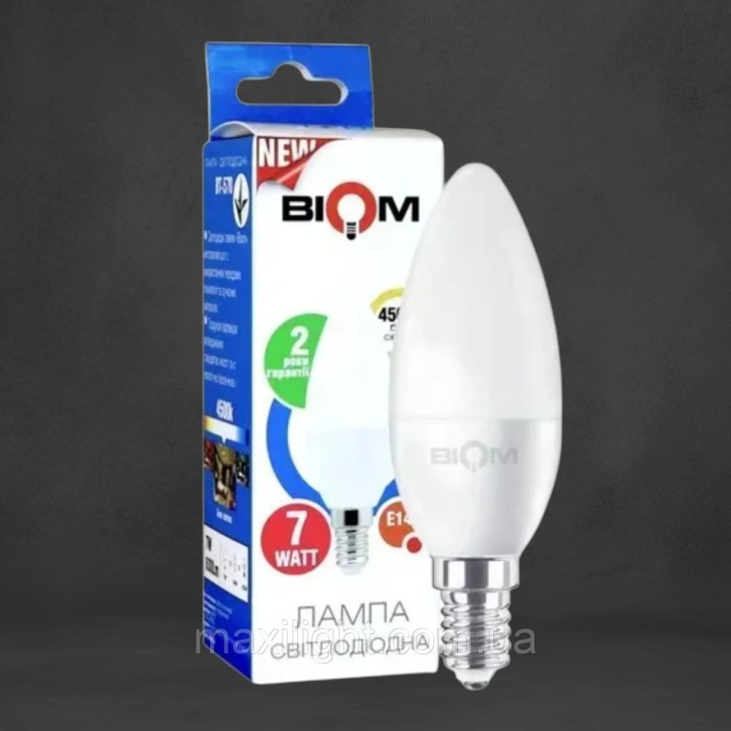 Теги: світлодіодна лампа E14, лампа свічка 7W, BIOM C37, LED лампа 4500K, енергозберігаюча лампа, лампочка E14 нейтральна, освітлення для дому