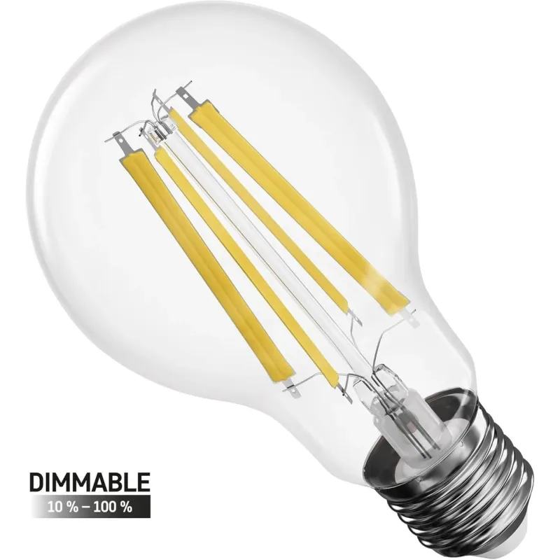 Ця лампа поєднує енергоефективність світлодіодної технології з функцією диммування. Потужність 11 Вт замінює традиційну лампу 75-100 Вт, забезпечуючи яскравий потік 1521 лм. Температура 2700K створює тепле, приємне для очей світло, а можливість регулювання яскравості дозволяє адаптувати освітлення під будь-яку ситуацію — від яскравого робочого світла до романтичного приглушеного освітлення.