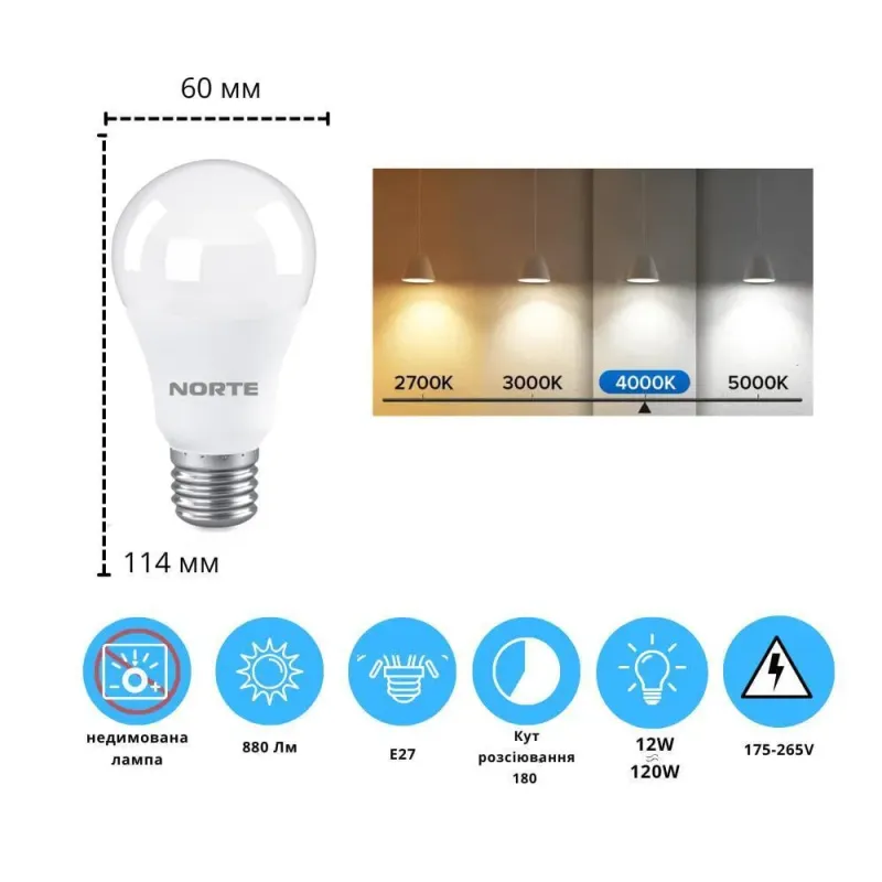 Теги: світлодіодна лампа, LED лампа E27, лампа 12W, NORTE лампа, енергозберігаюча лампа, лампа 4000K, LED освітлення