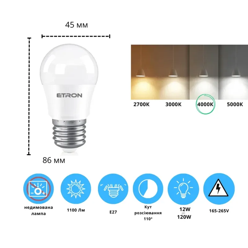 Замовте Світлодіодну лампу LED 12W 4000K E27 G45 ETRON прямо зараз і почніть економити вже сьогодні!