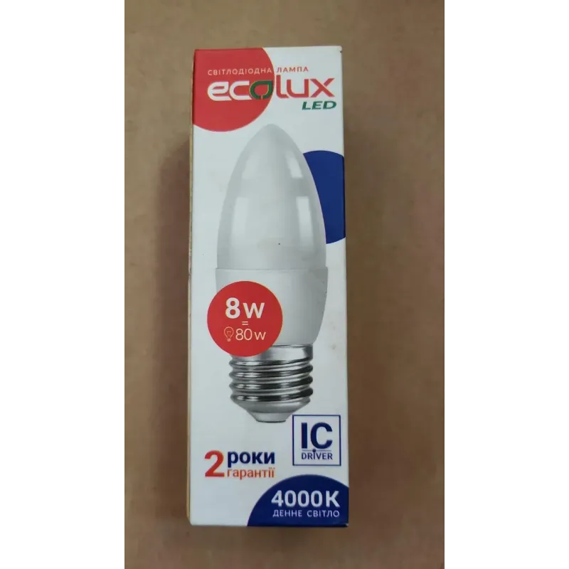 Теги: світлодіодна лампа E27, LED лампа 8W, лампа свічка 4000K, енергозберігаюча лампа, денне світло E27, Ecolux LED, лампа для дому