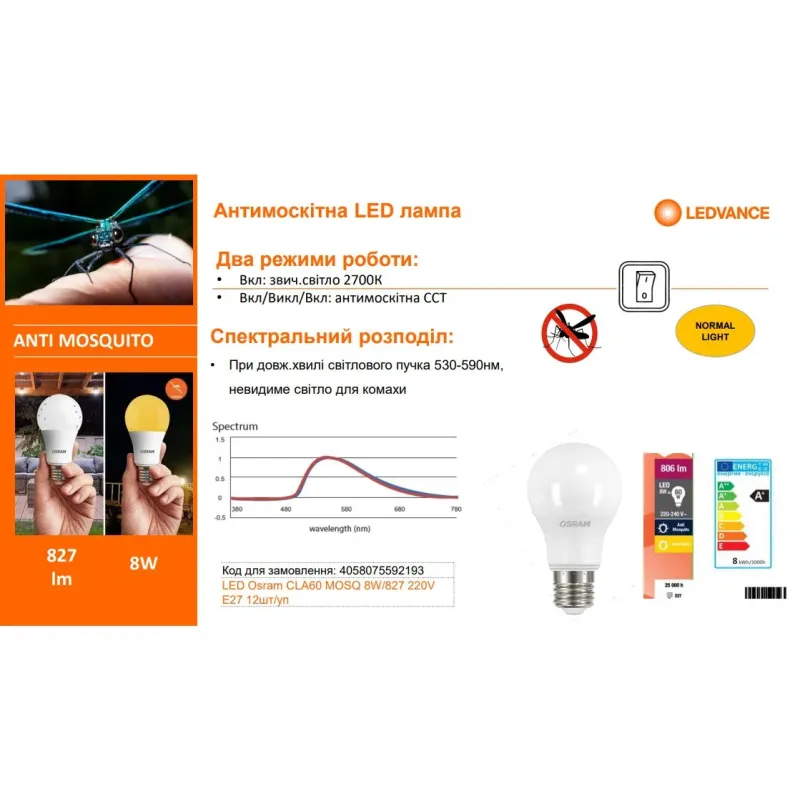 Замовте світлодіодну лампу OSRAM MOSQ A60 LED 8W/827 E27 прямо зараз та насолоджуйтесь комфортним відпочинком без комарів!