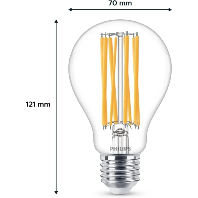 Світлодіодна лампа Philips E27 150 Вт забезпечує яскраве тепле світло, яке створює затишну атмосферу у вашому домі чи офісі. Скляна колба преміум-якості та передові LED-технології гарантують довговічність до 15 000 годин роботи при мінімальному споживанні електроенергії.