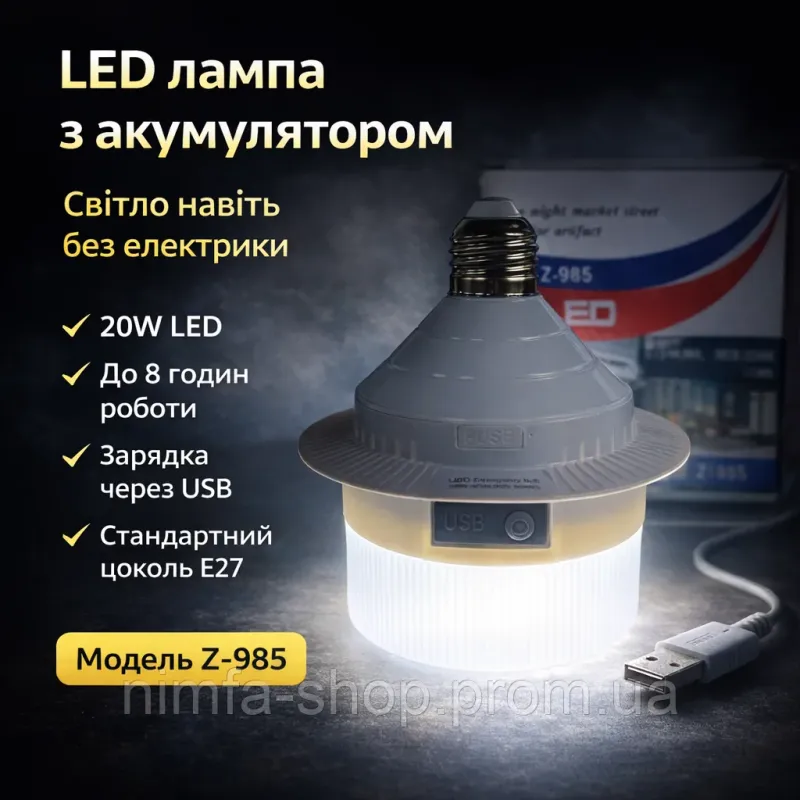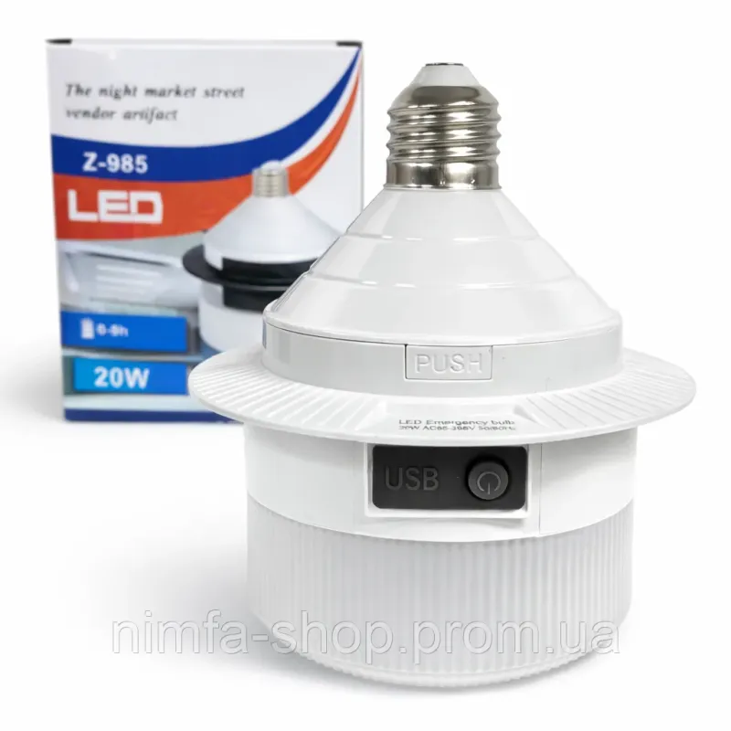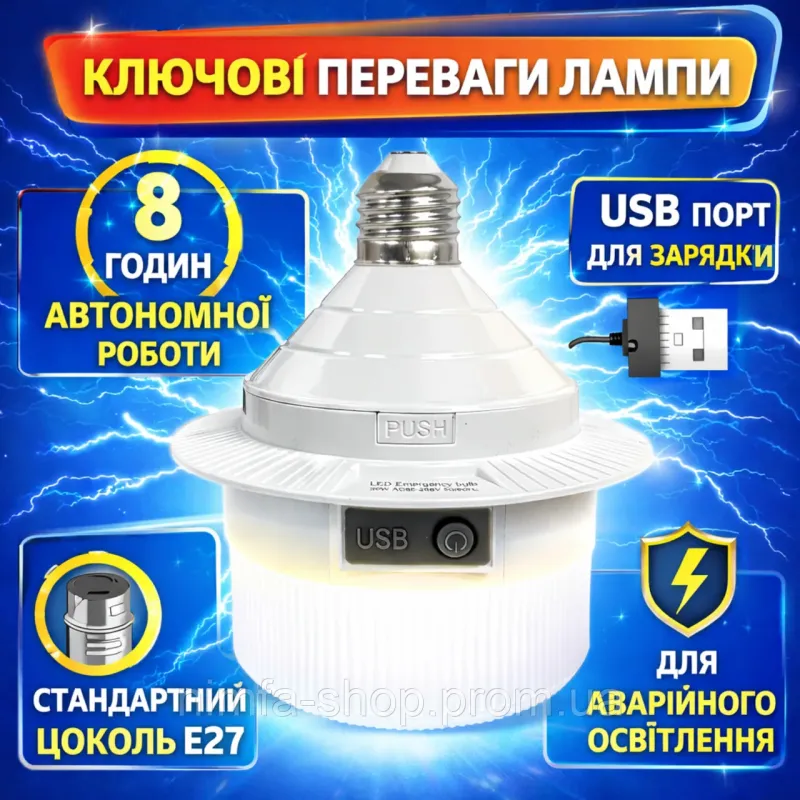 Теги: аварійна лампа, LED лампа з акумулятором, лампа з USB зарядкою, автономна лампочка E27, світло при відключенні електрики, лампа для дому 20W
