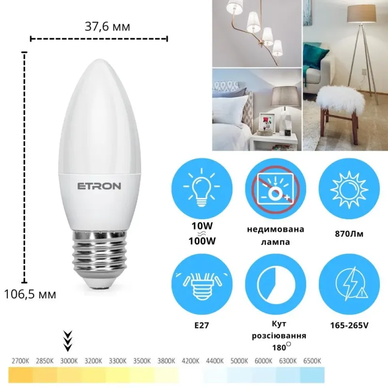 Теги: LED лампа E27, світлодіодна лампа 10W, лампа тепле світло 3000K, ETRON лампа, енергозберігаюча лампа, лампа С37 свічка, LED освітлення